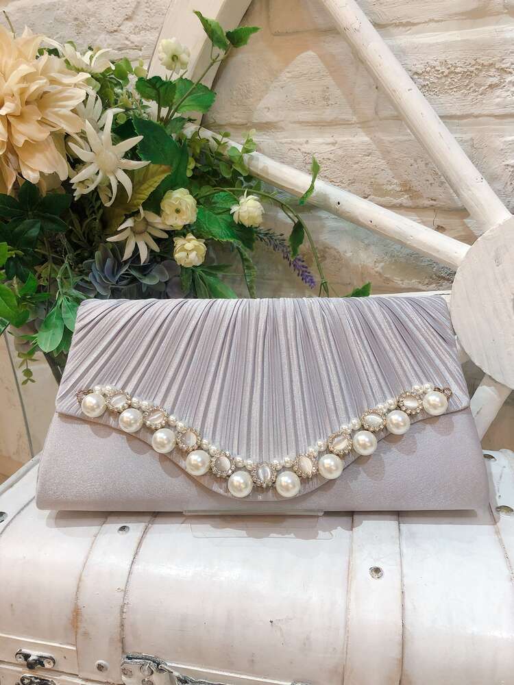シルバーグレー花形ビジュとパール付きプリーツクラッチバッグ