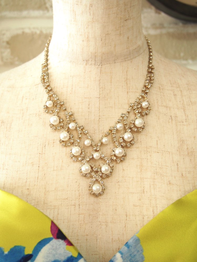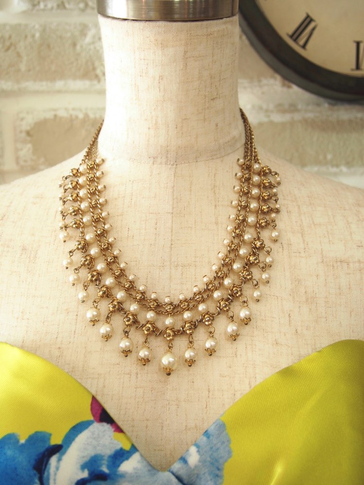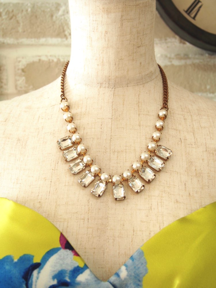 パール×スクエアビジューアンティークゴールドネックレス