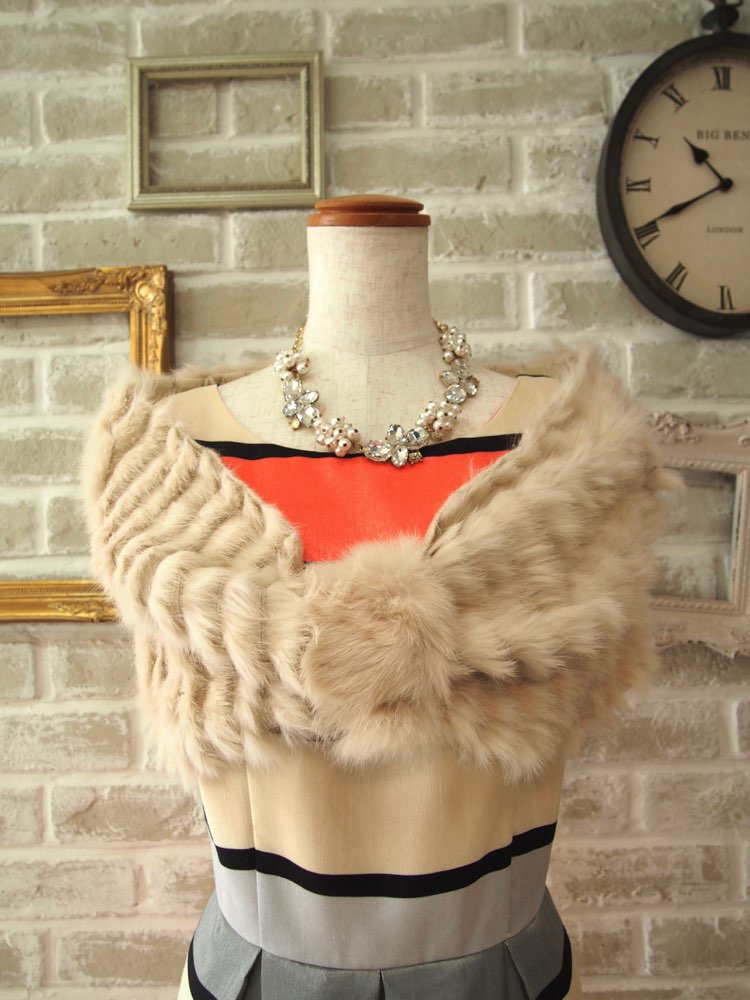 ベージュラビットファーリボンニットケープ
