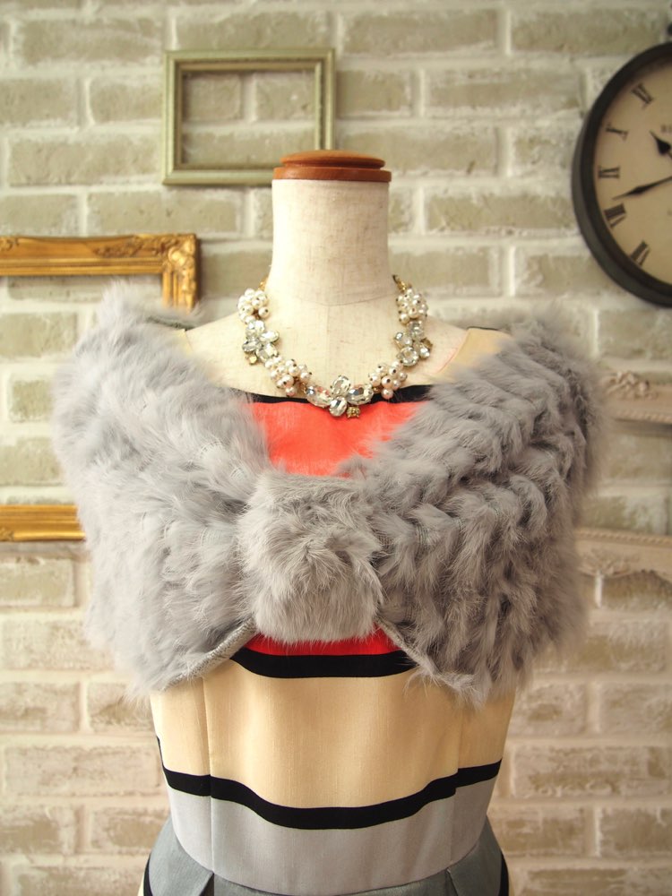 グレーラビットファーリボンニットケープ