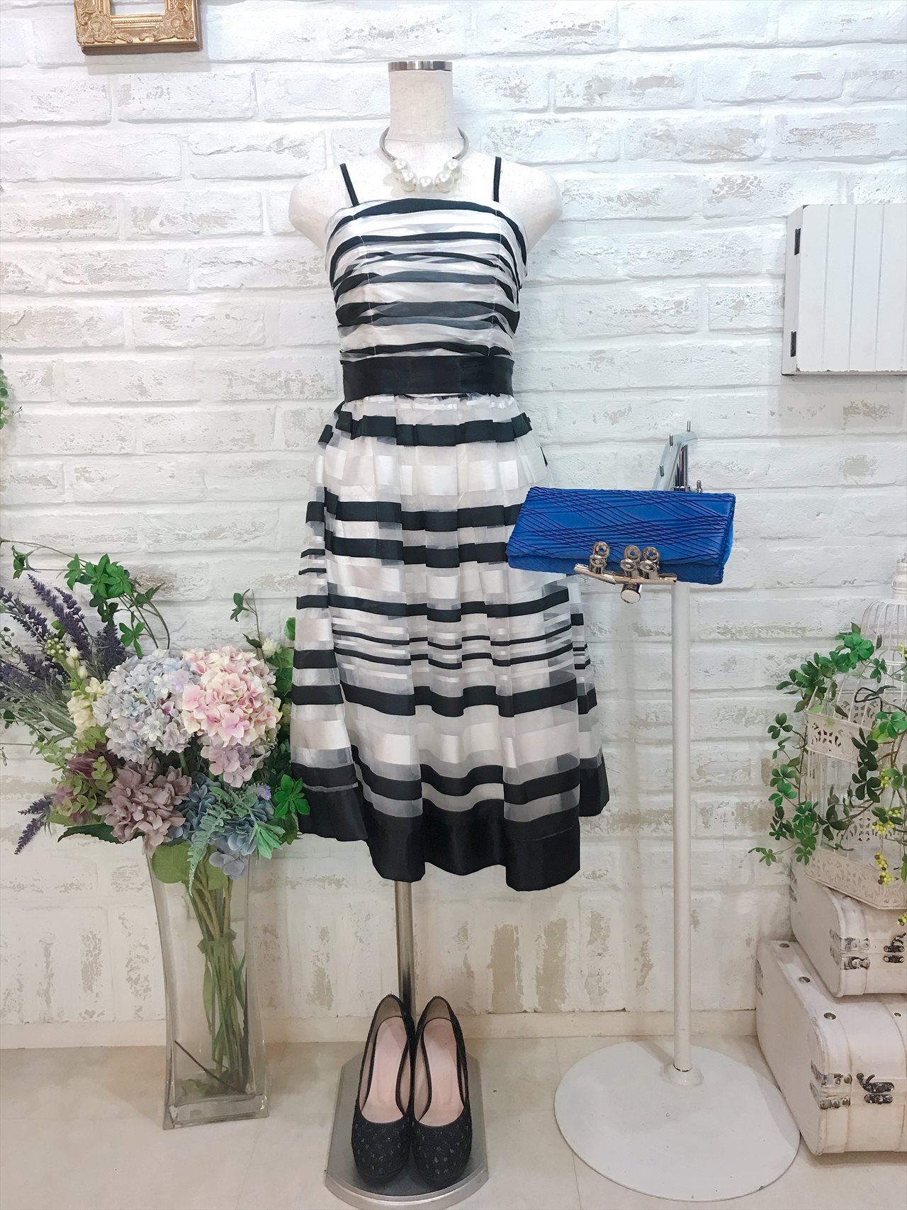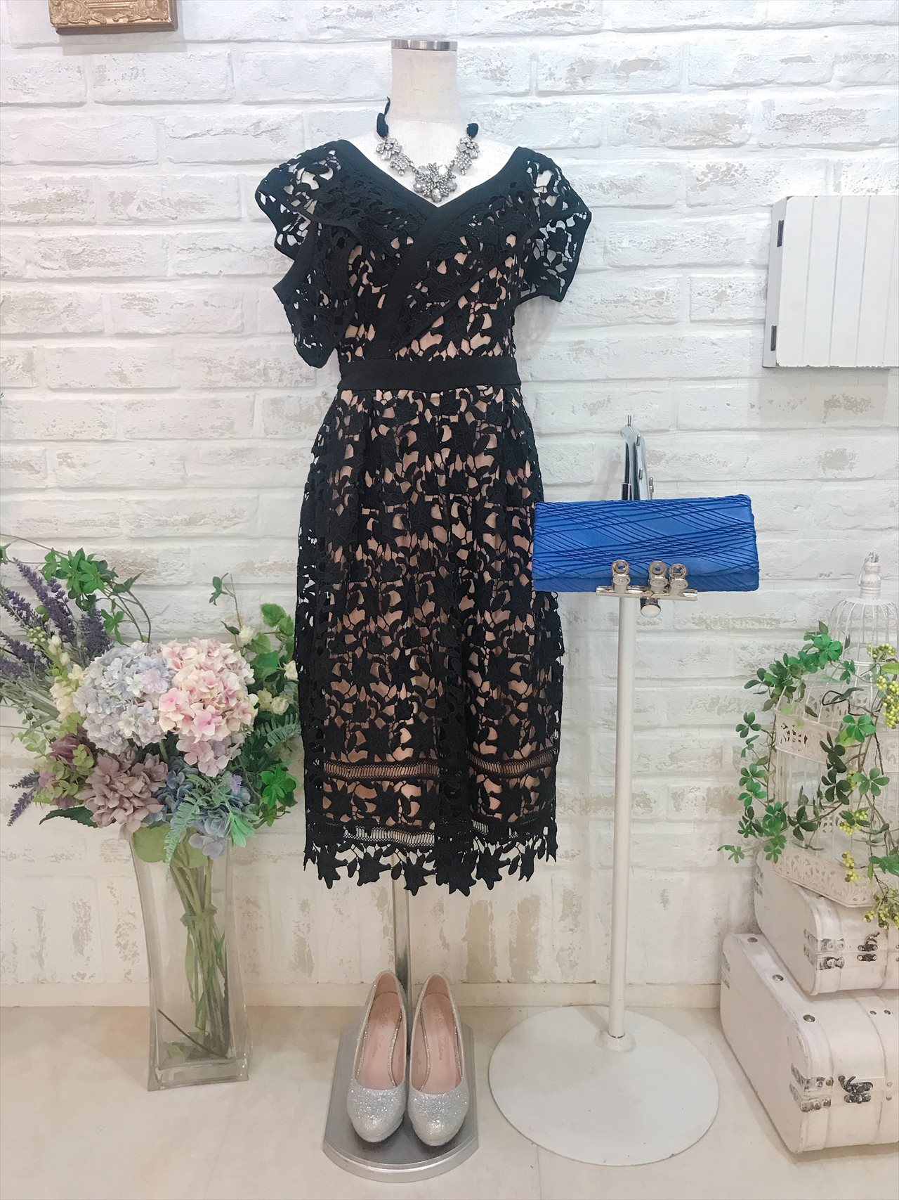 ブラックショートスリーブ刺繍裾フリルミモレ丈ドレ...