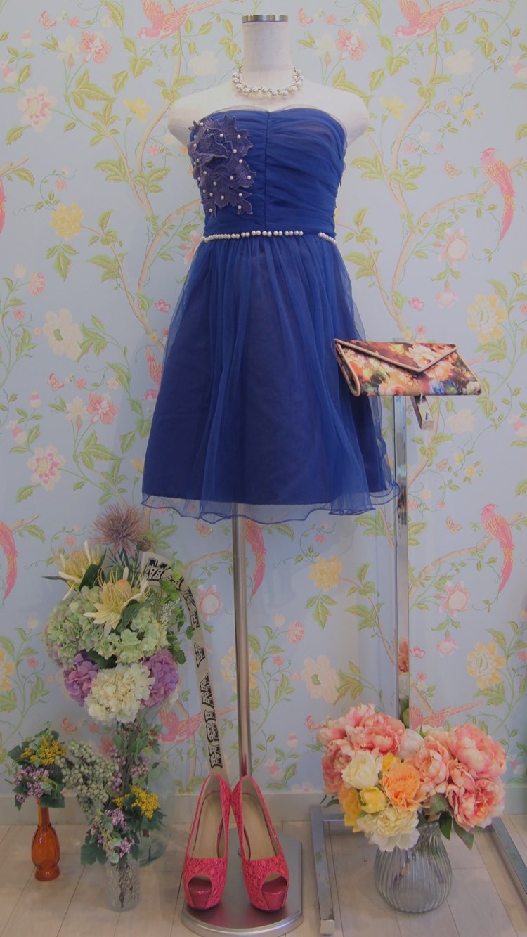 ロイヤルブルーバラレースパールデザインフレアベアドレス
