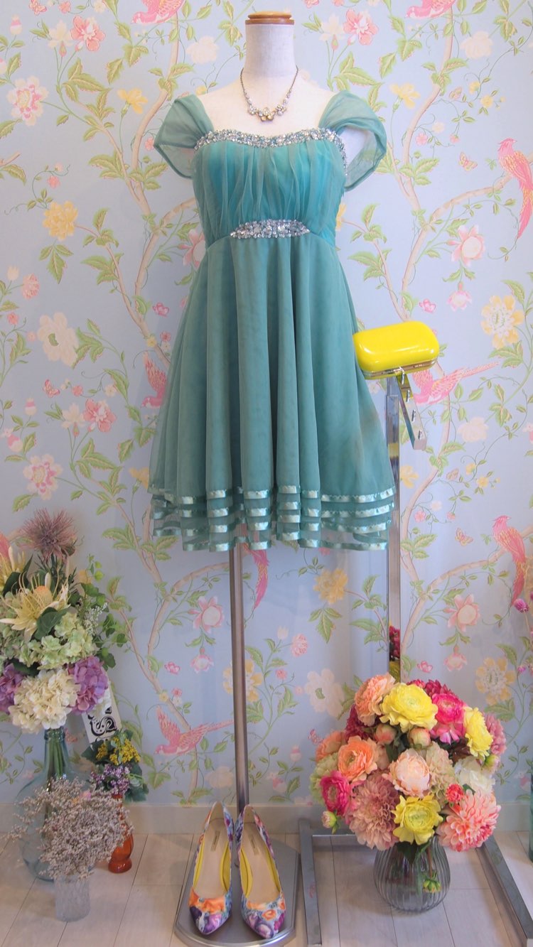 ★エメラルドグリーンチュールスリーブビジューフレアSKドレス