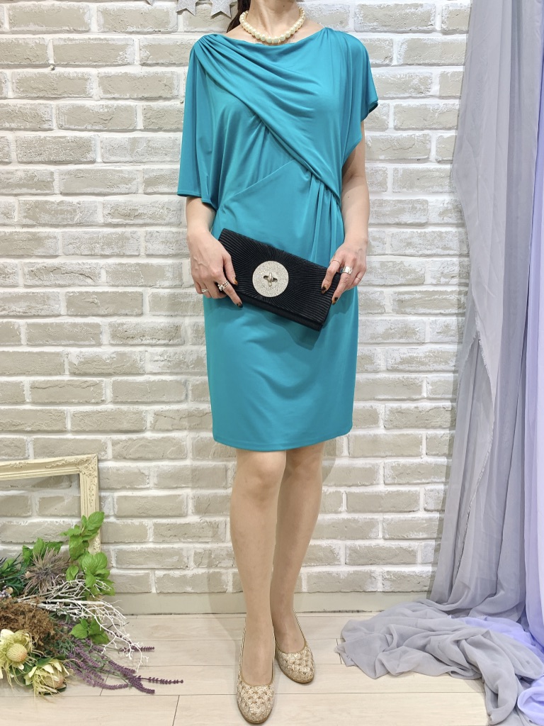 エメラルドグリーンアシンメトリースリーブドレス