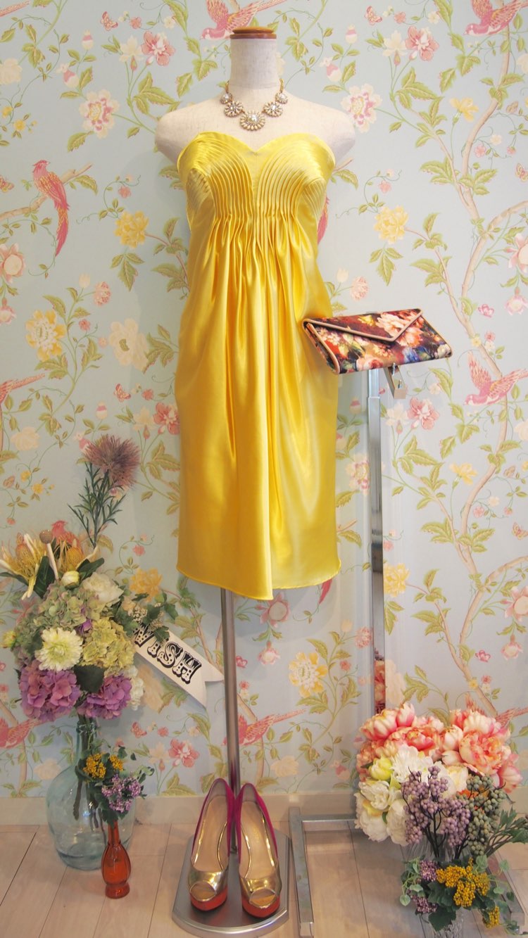 サテンイエロープリーツバンドゥドレス