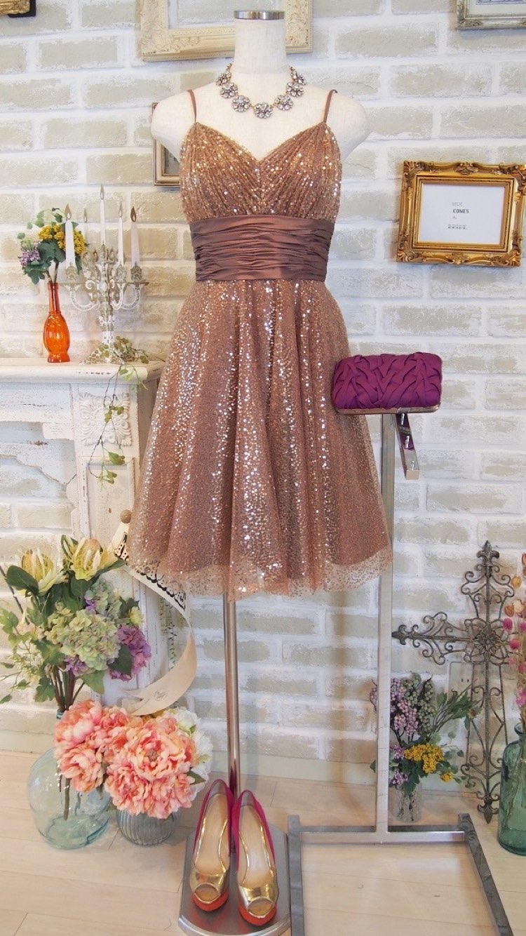 ブラウンリボン切替スパンコールVネックドレス