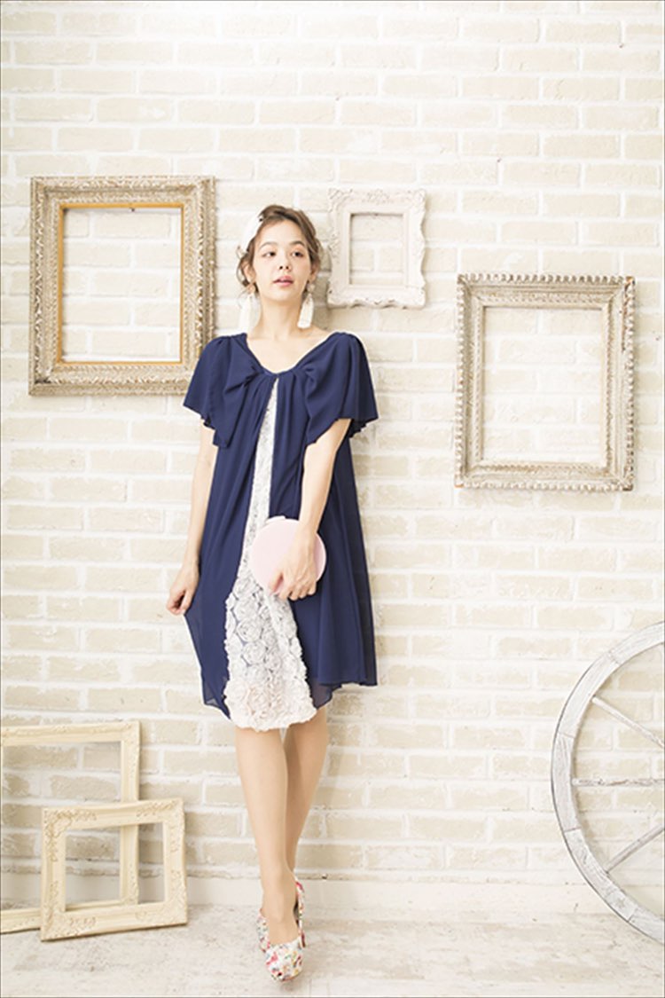 ネイビーホワイトフラワーレース付きドレス