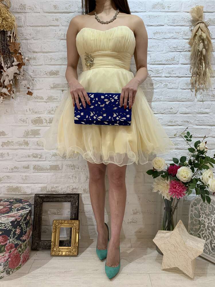 パステルイエロー右ウエストビジューボリュームミニベアドレス