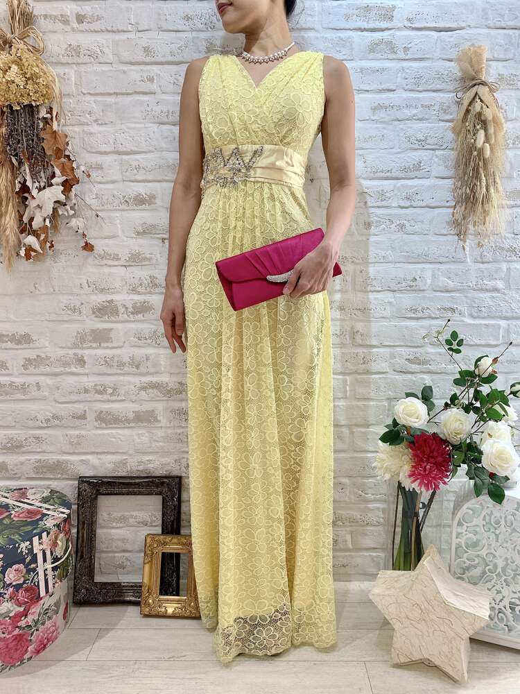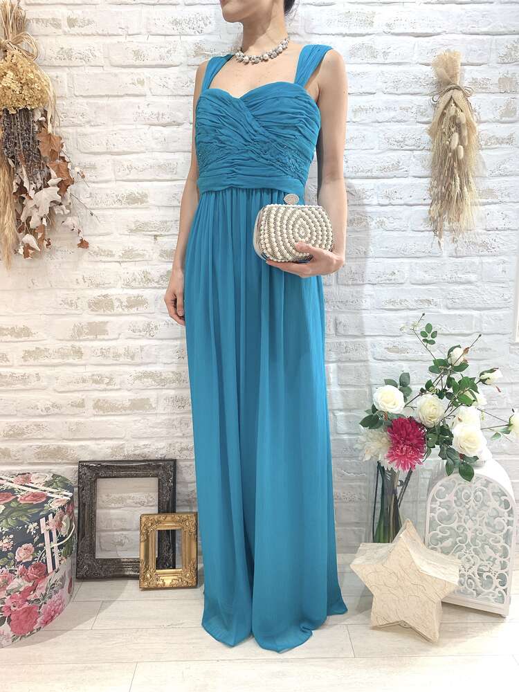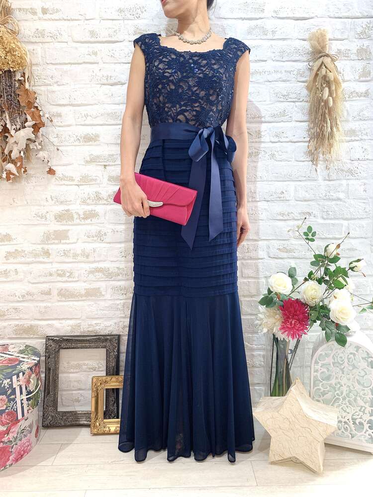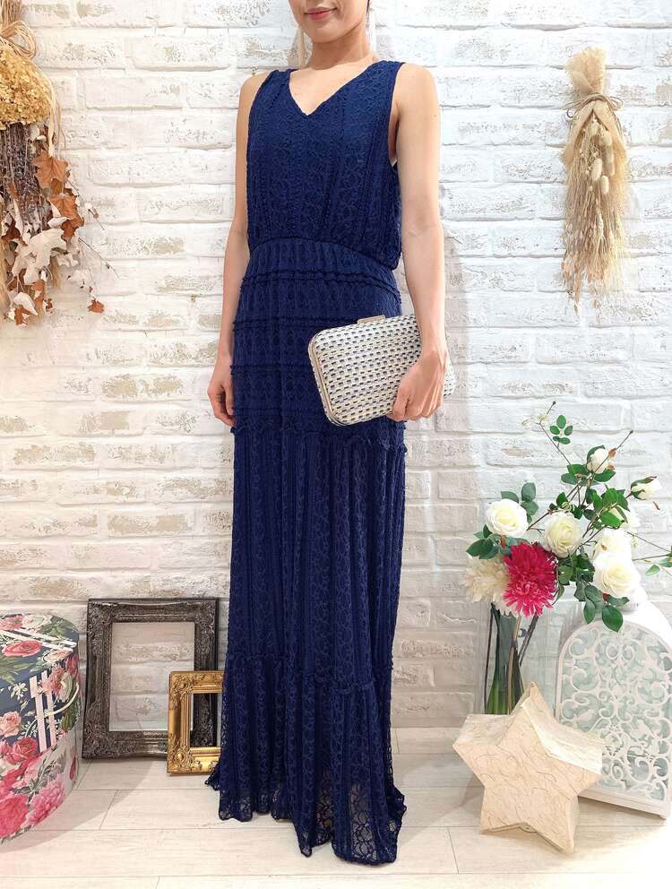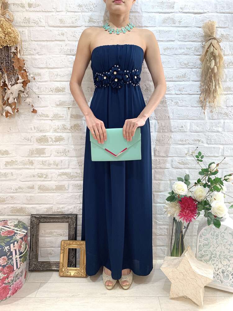 ウエスト花コサージュ付ネイビーロングベアドレス