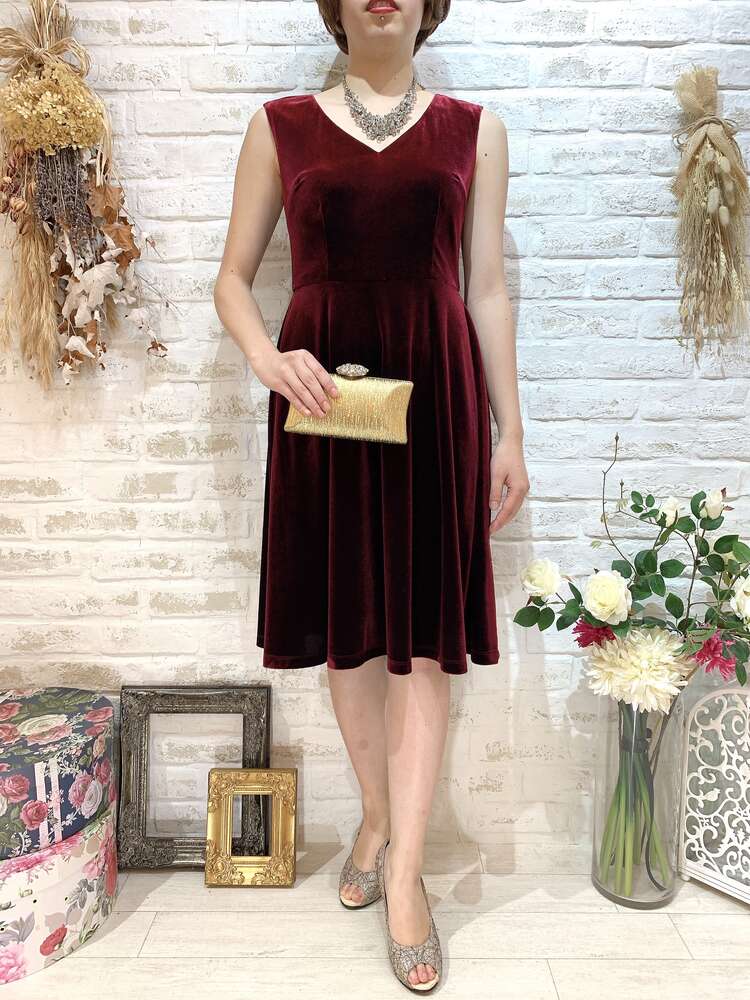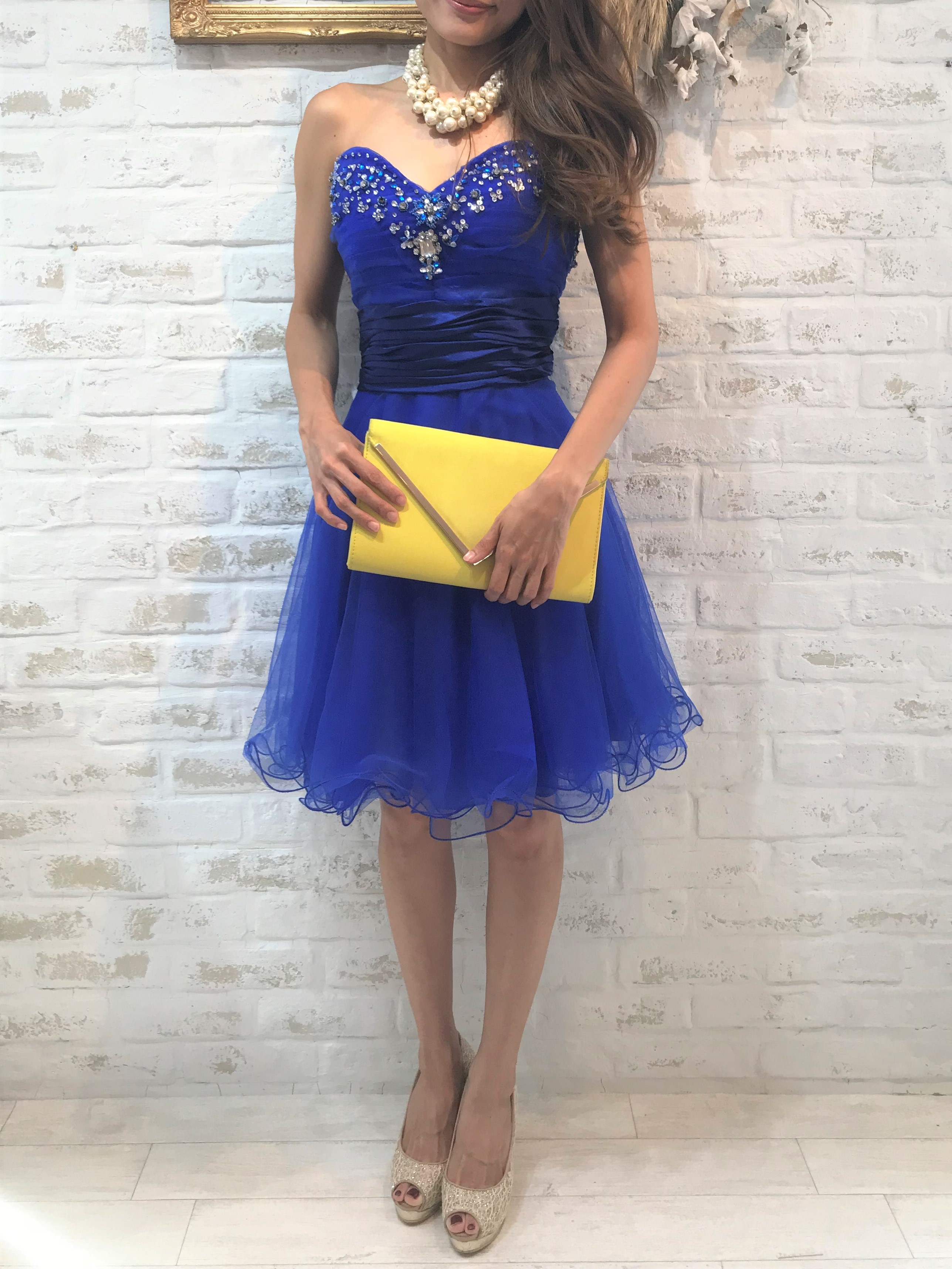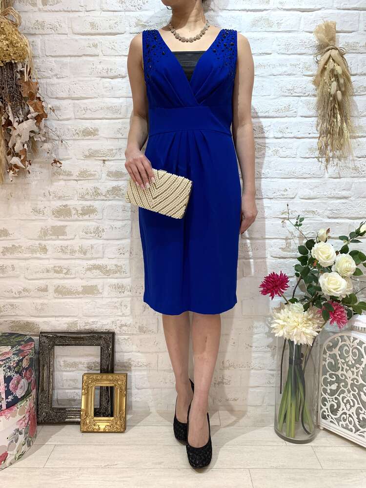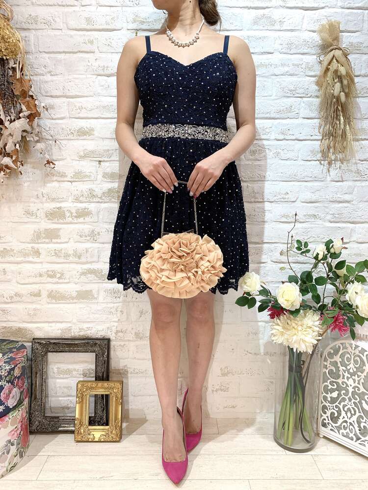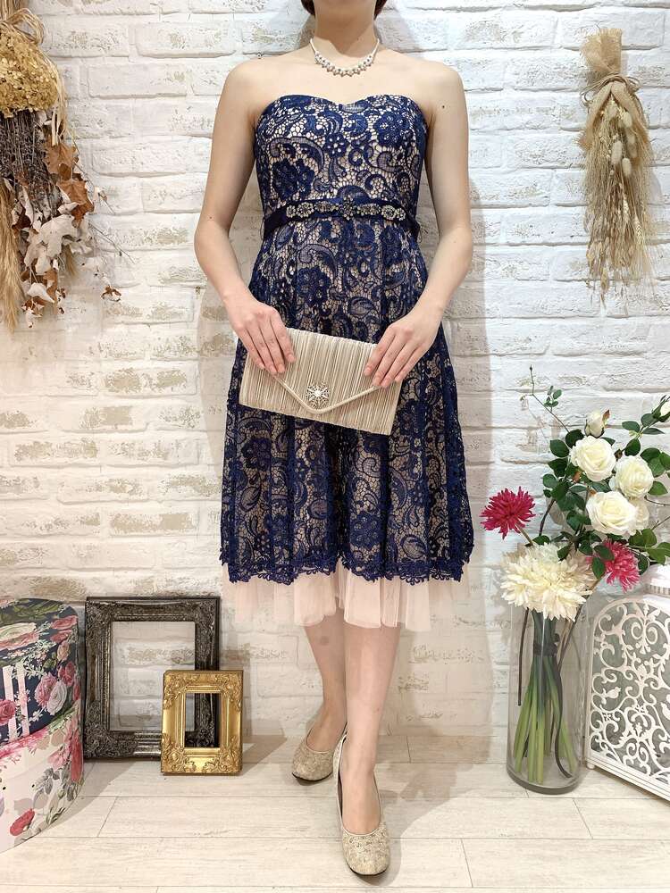 ビジューウエストリボン付ネイビーレース膝下ベアドレス