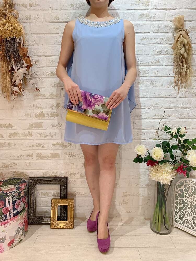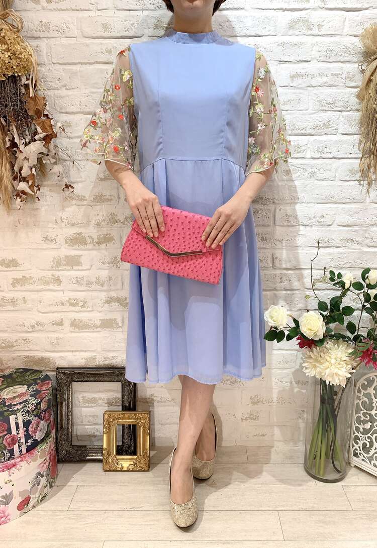 袖カラフル花柄シースルーハイネックドレス(ブルー)