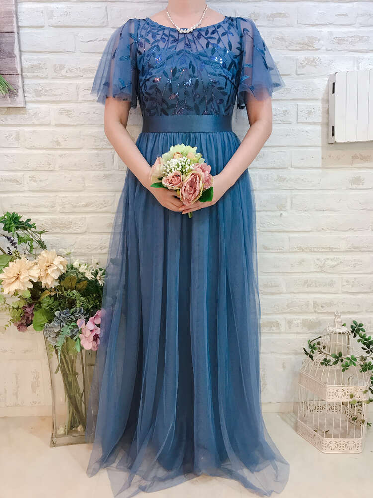 くすみブルー袖あり胸元スパンコールリーフ模様ロングドレス