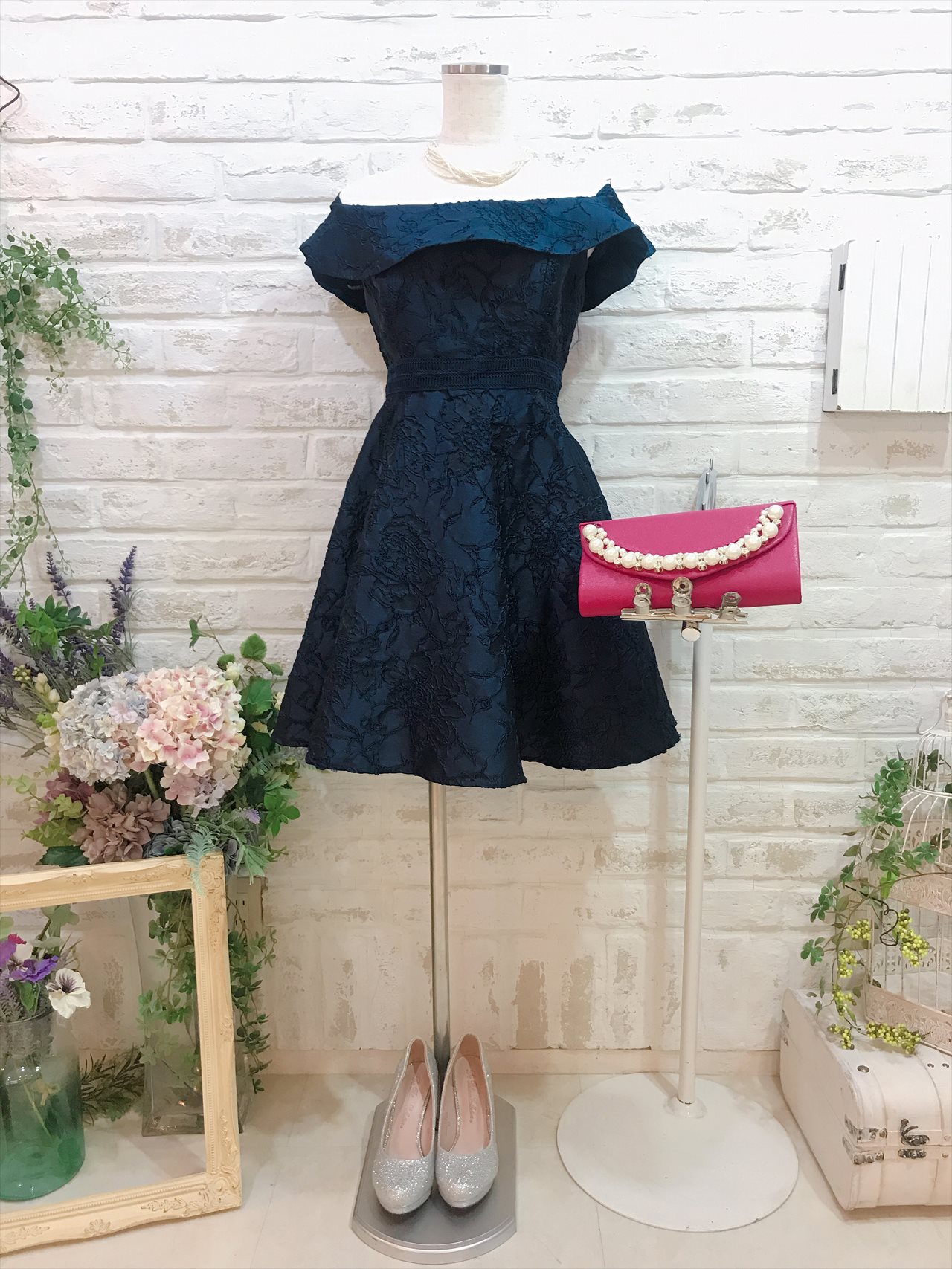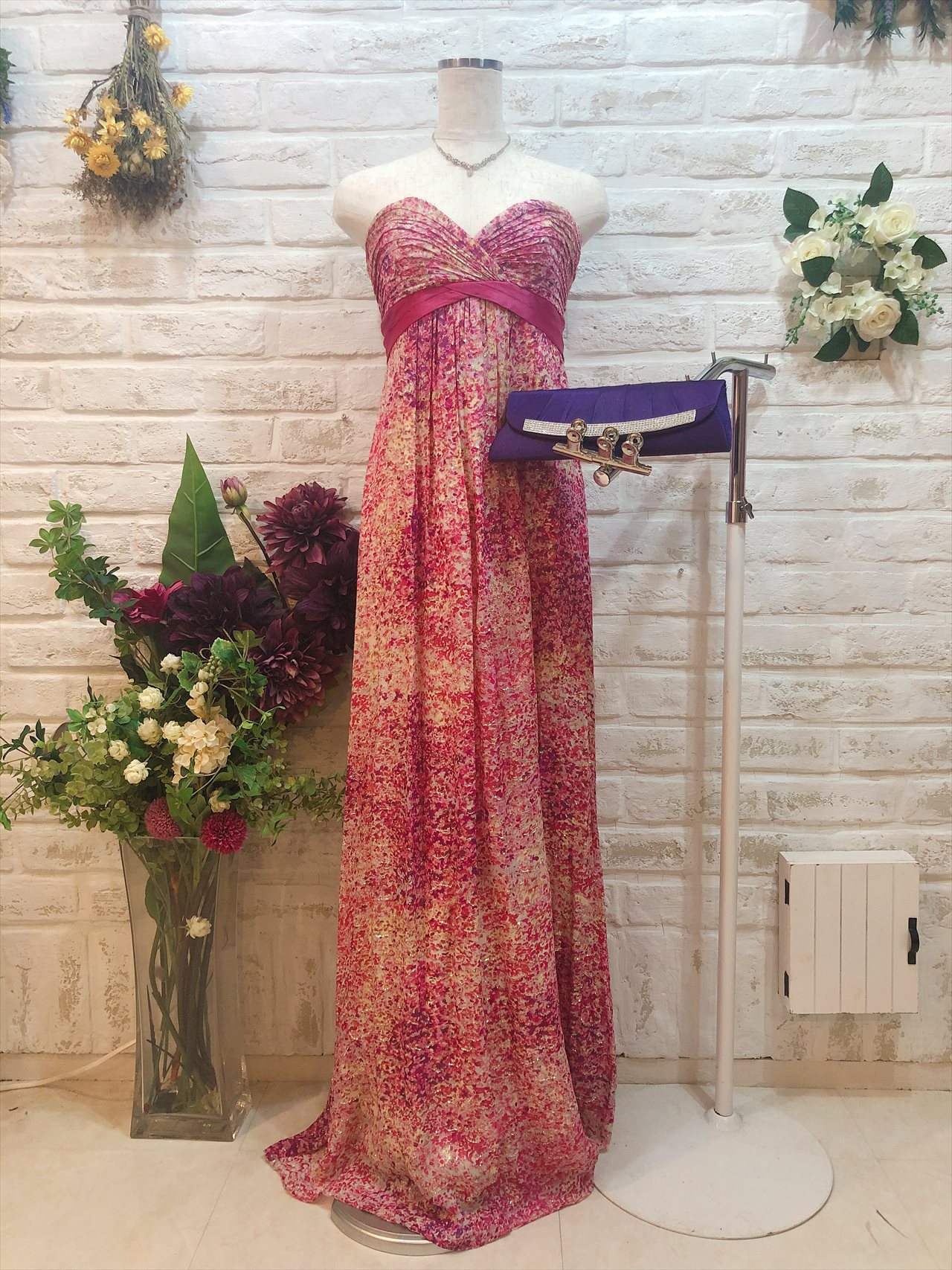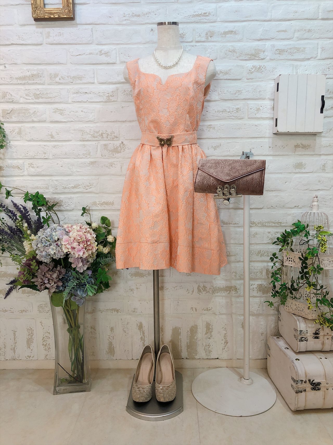 コーラルピンク花柄蝶モチーフベルト付き肩ありドレス