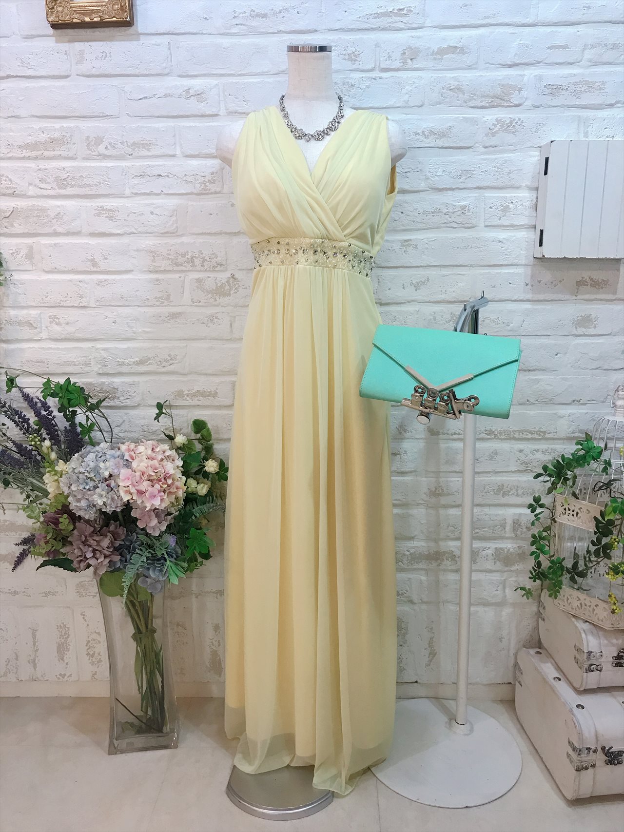 レモンイエロー胸元レースノースリーブ膝丈ドレス