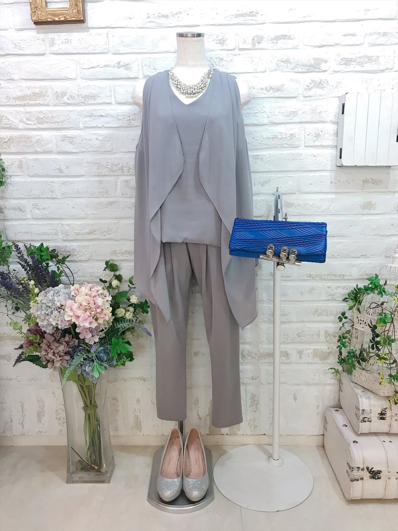 くすみブルー袖あり胸元スパンコールリーフ模様ロン...