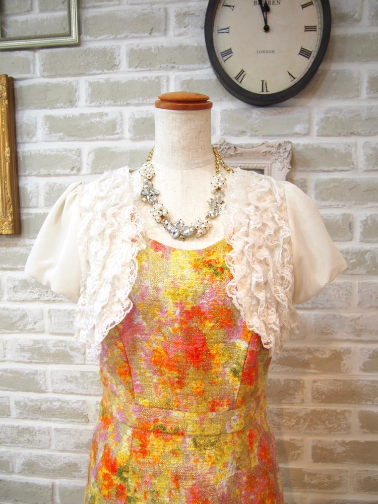 オフホワイト身頃レースフリルパフスリーブボレロ