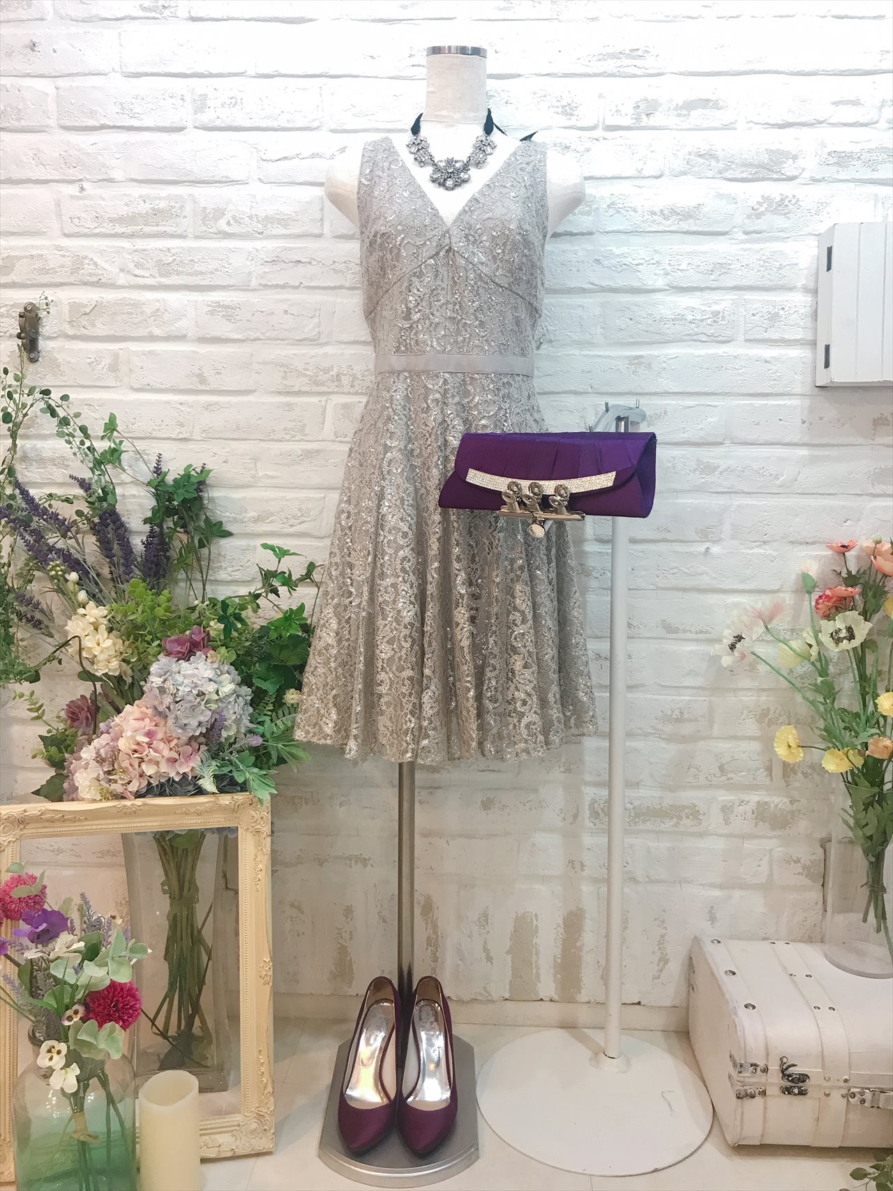 ブラウンゴールド袖ありオーバーレースミモレ丈ドレス