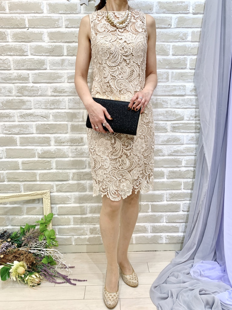 ADRIANNA PAPELL ベージュフローラルレースタイトドレス