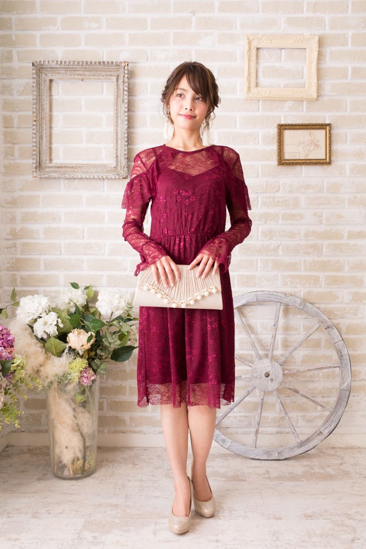 ボルドーカラーゼンレースロングスリーブ膝丈ドレス