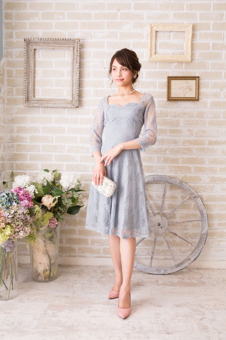 ペールグレー全レース柄ロングスリーブフレアドレス