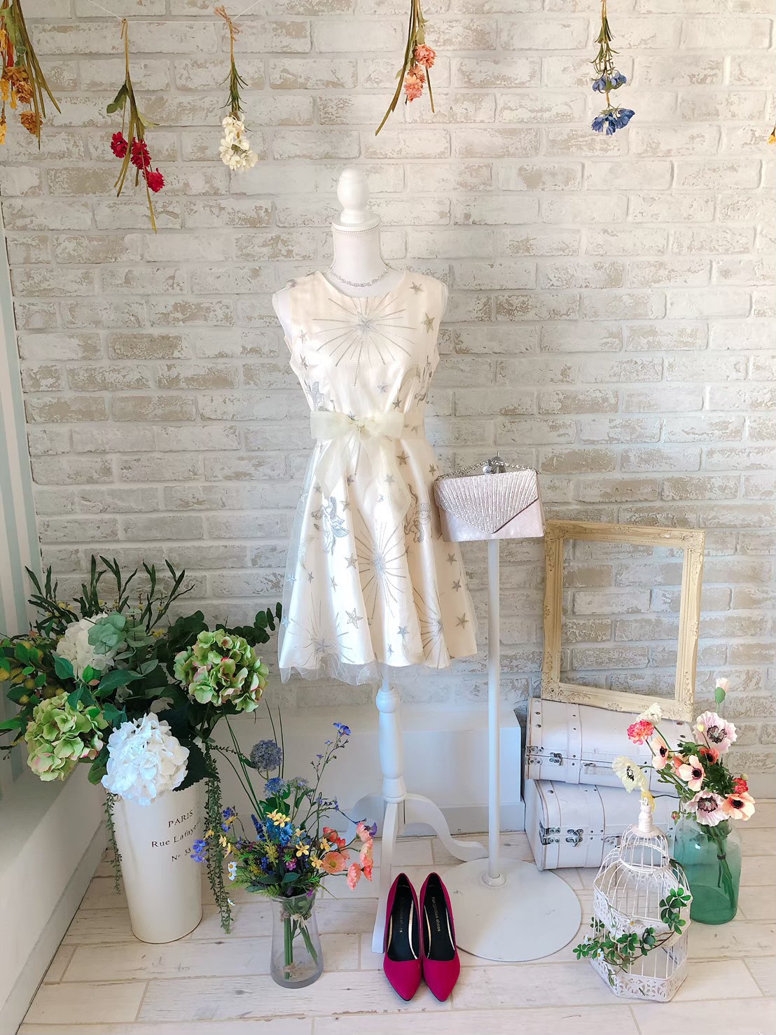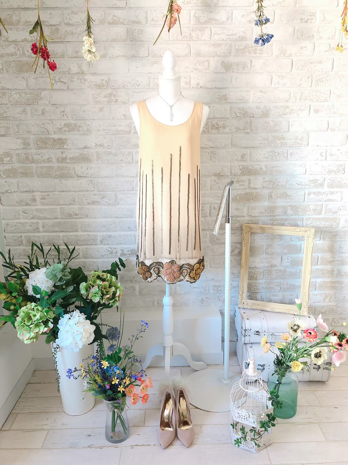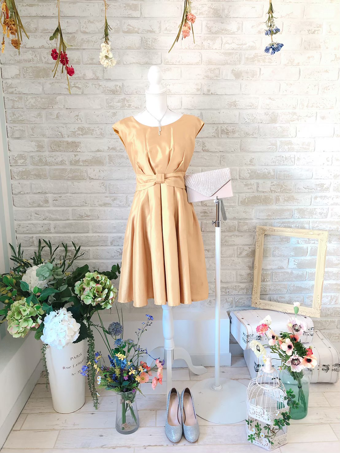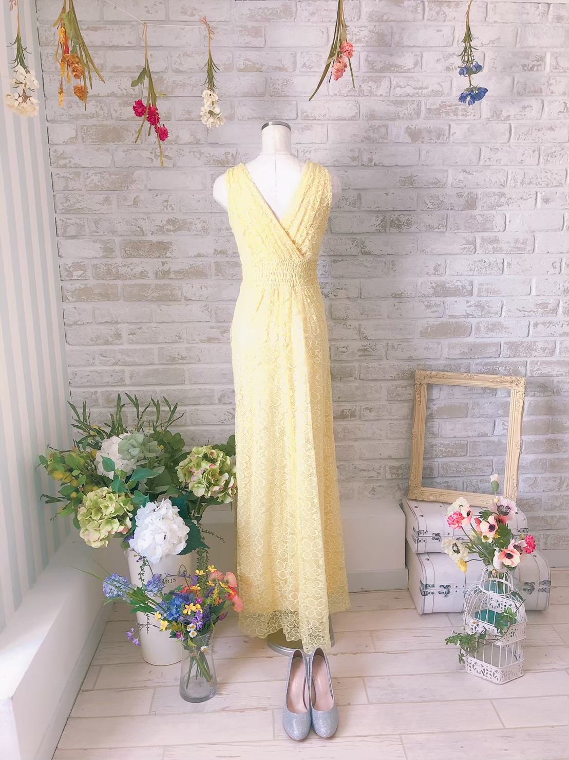 イエロー・お花レースウエストビジュー切り替えロングドレス