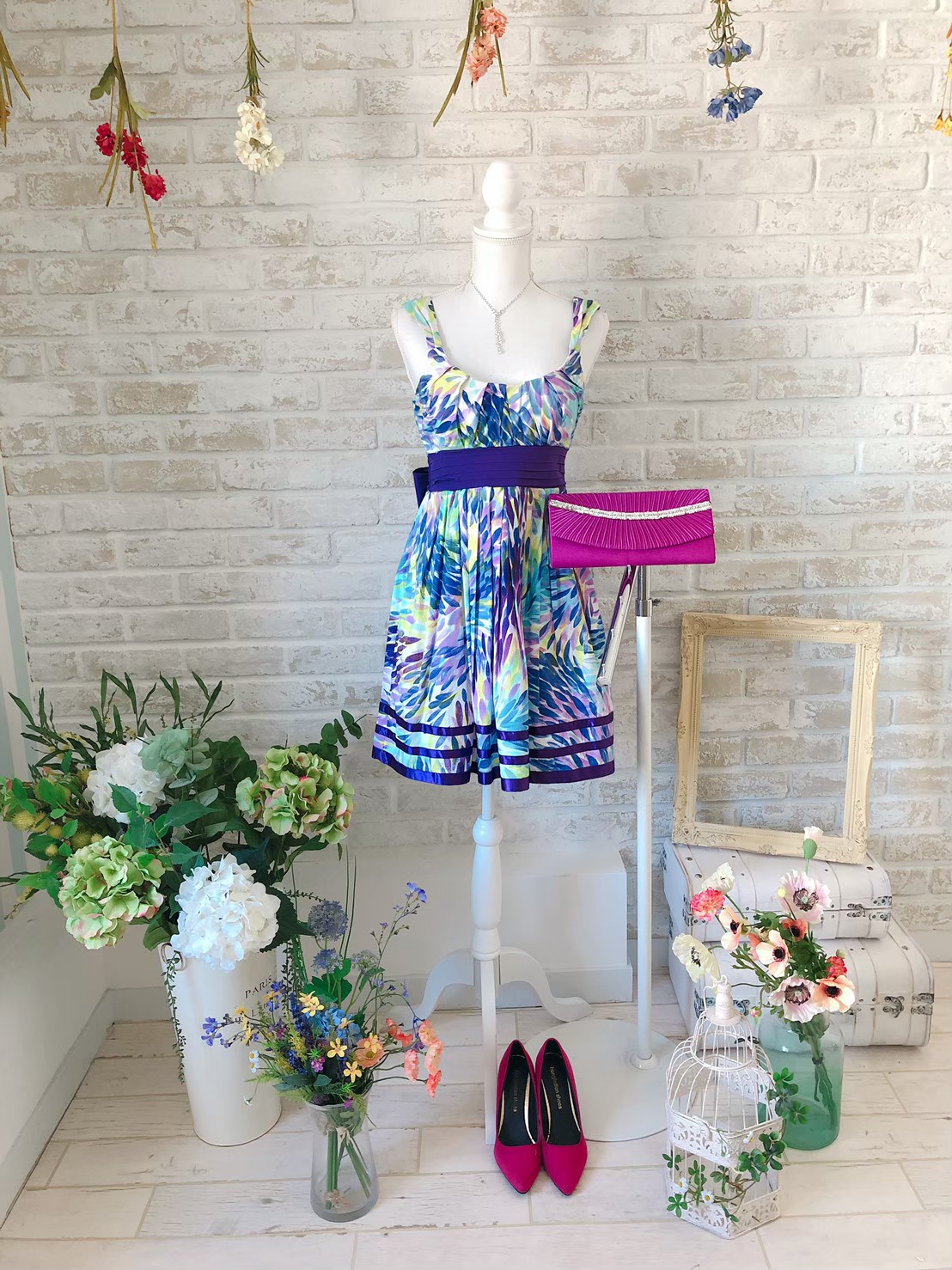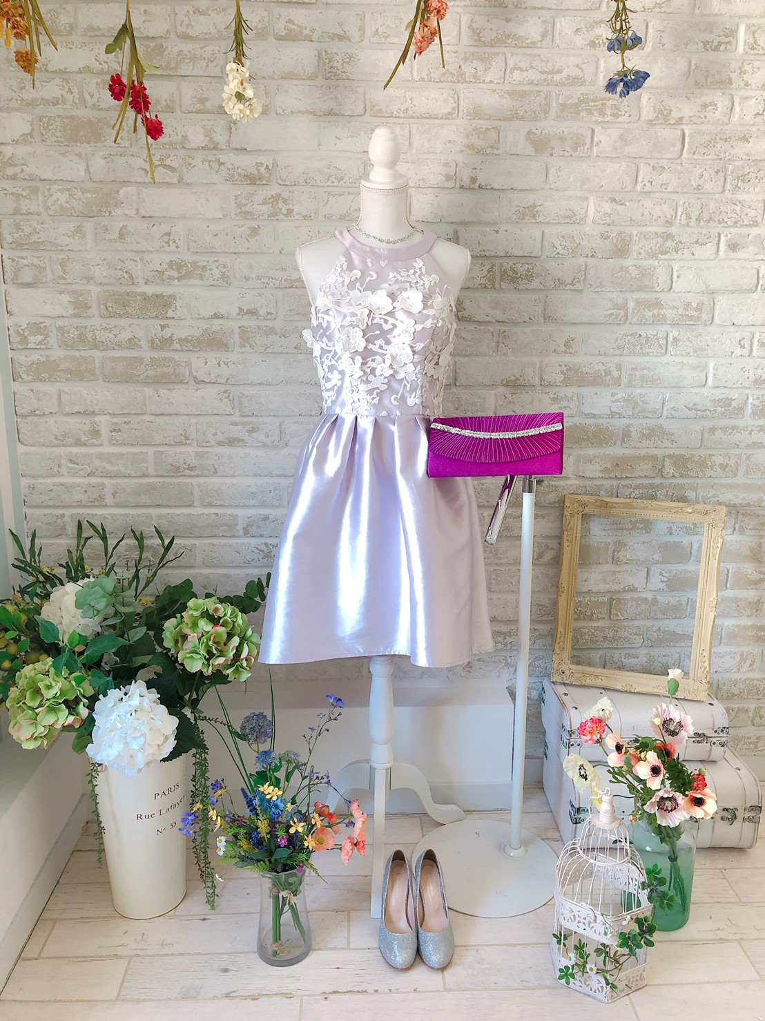 パステルパープルアメリカンスリーブ花柄レースドレス