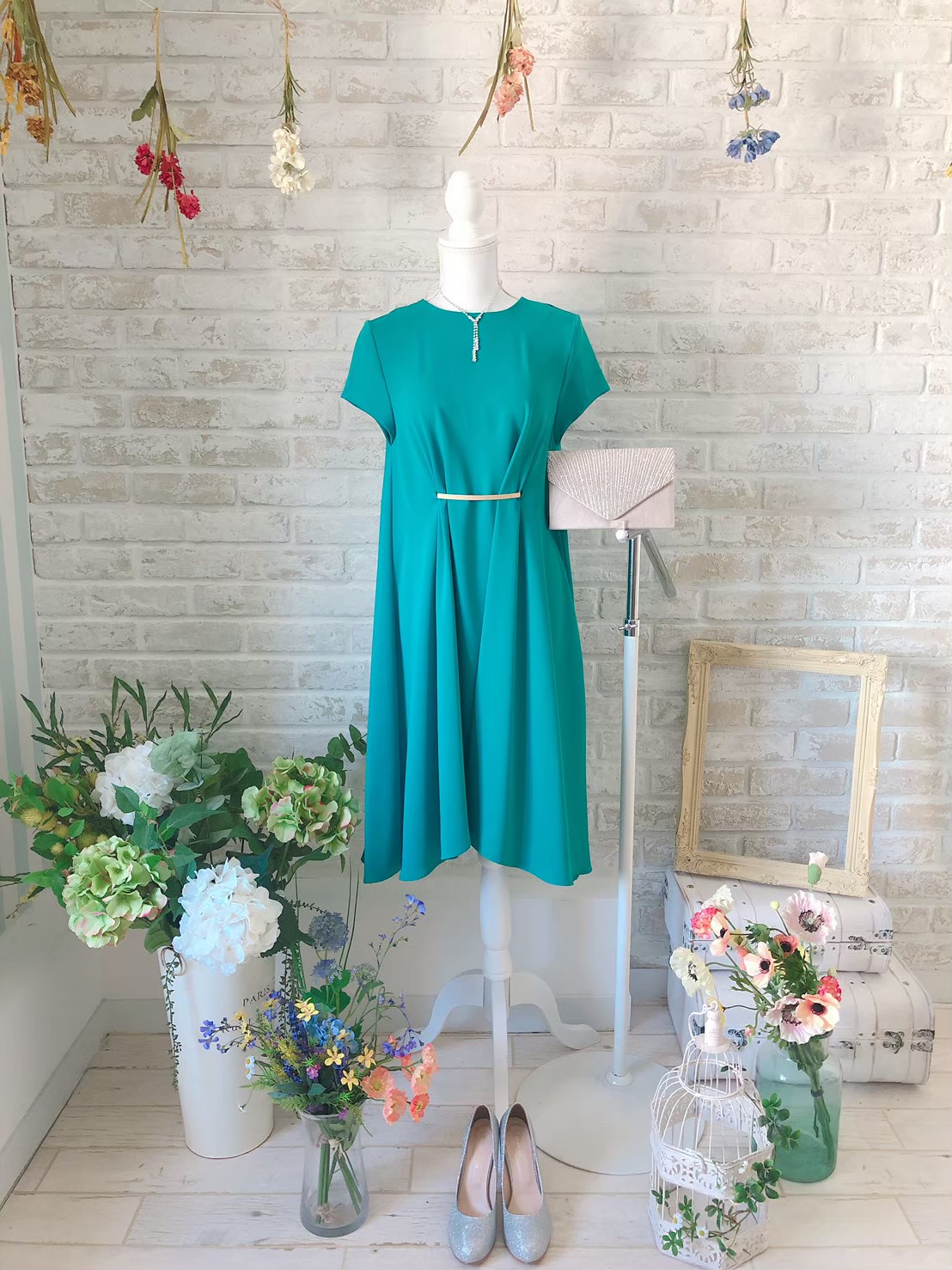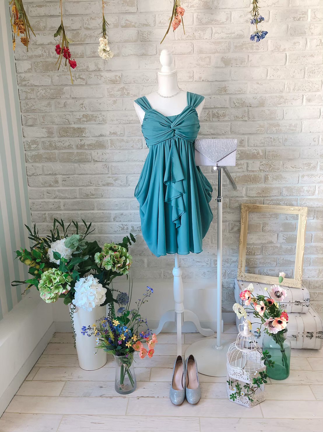 モスグリーン・ワンショルダー・お花レース×シフォンドレス