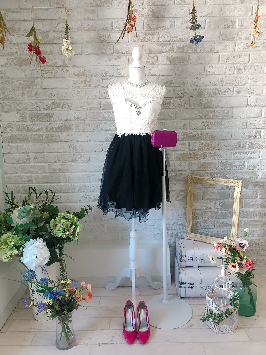 ホワイト切り替えブラックチュールミニ丈ドレス