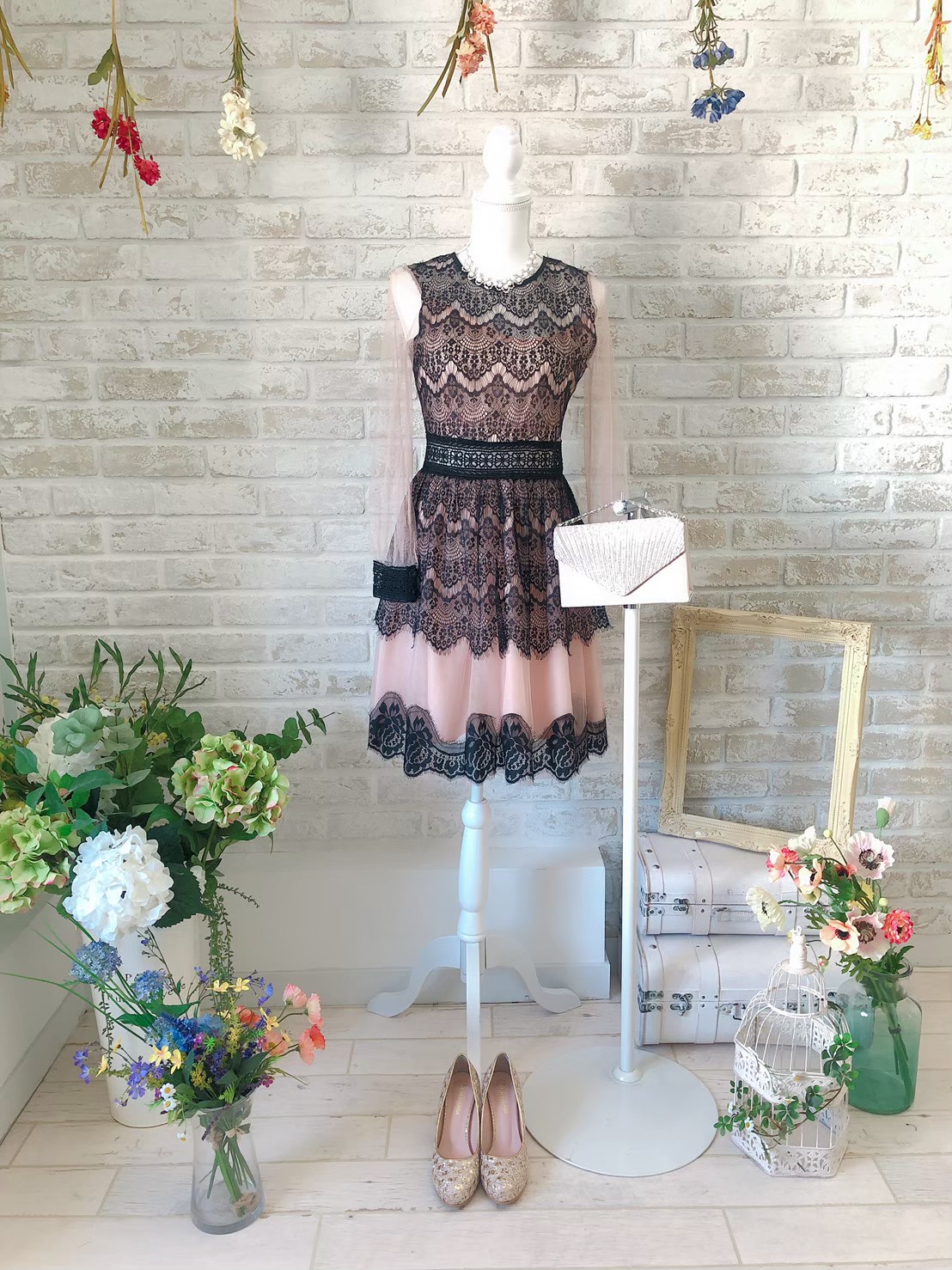 ベージュ・ブラックレースドレス