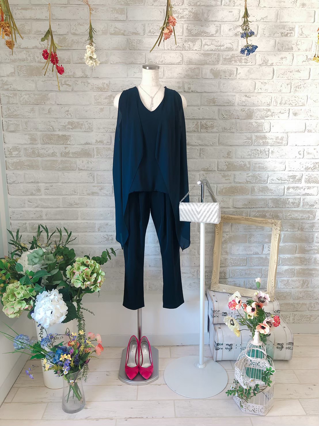 ネイビー・Vカットトップス×パンツ・ドレス