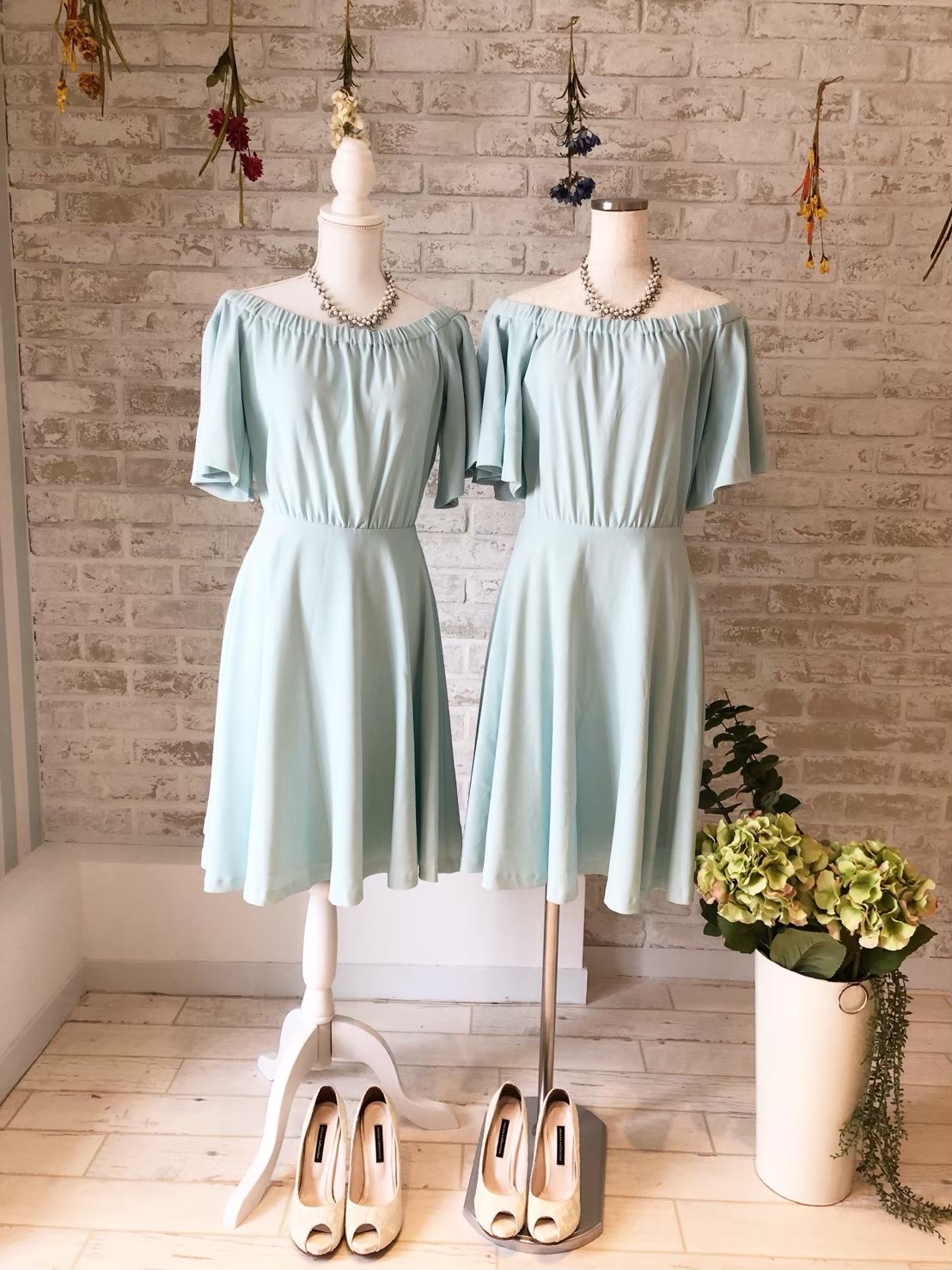 ミントグリーン・オフショルダードレス