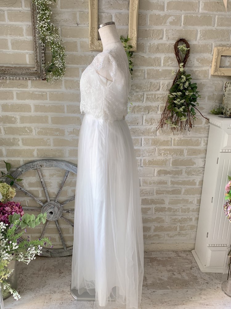 花嫁ウェディング用背面くるみボタンオフショルダーホワイトレースボレロ
