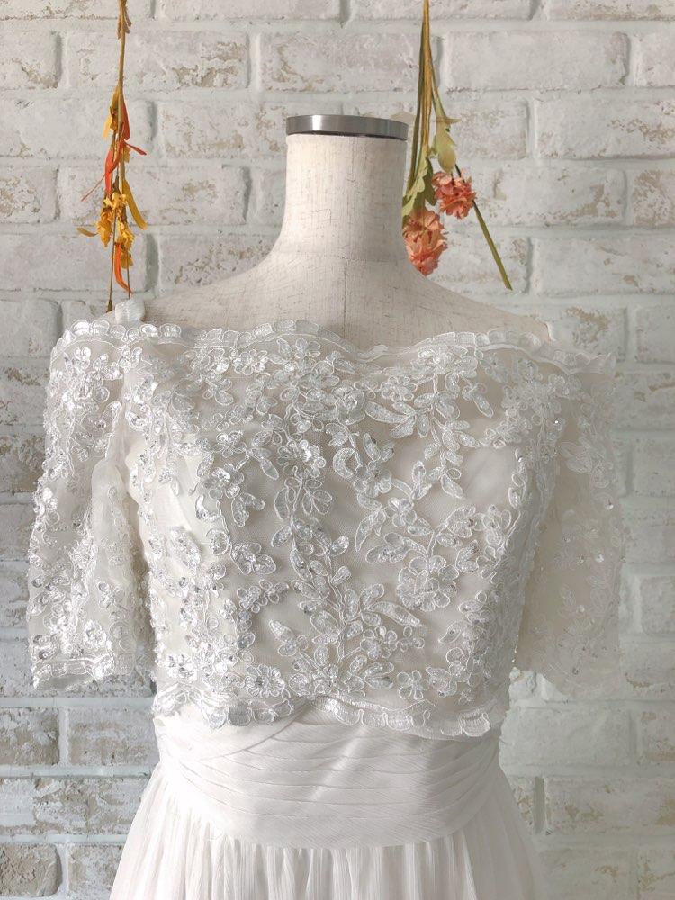 花嫁ウェディング用背面くるみボタンオフショルダーホワイトレースボレロ