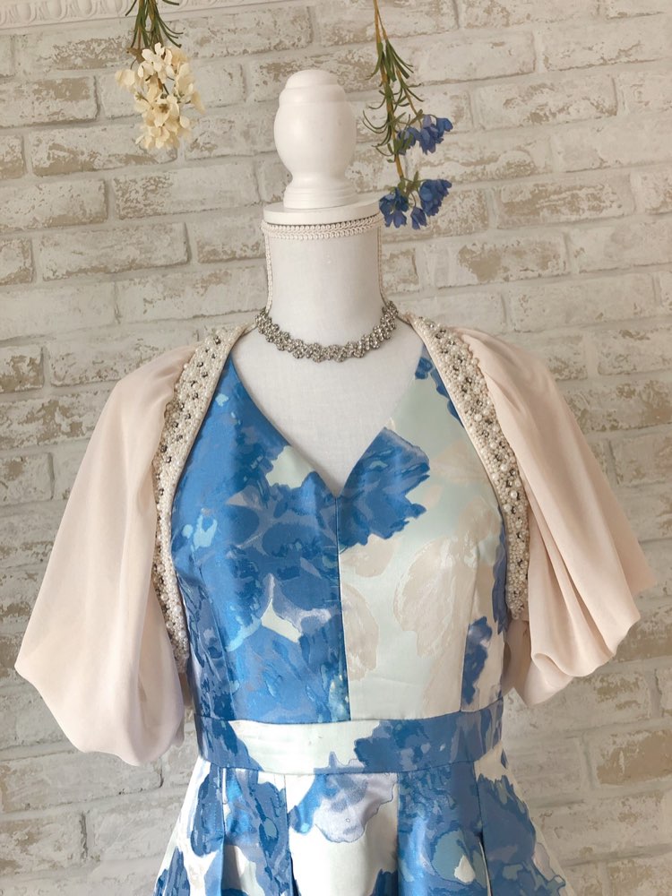 花嫁ウェディング用二の腕きになる方裾リアルフェザー付き首元大粒ビーズ袖なしクリームフレアレースケープボレロ