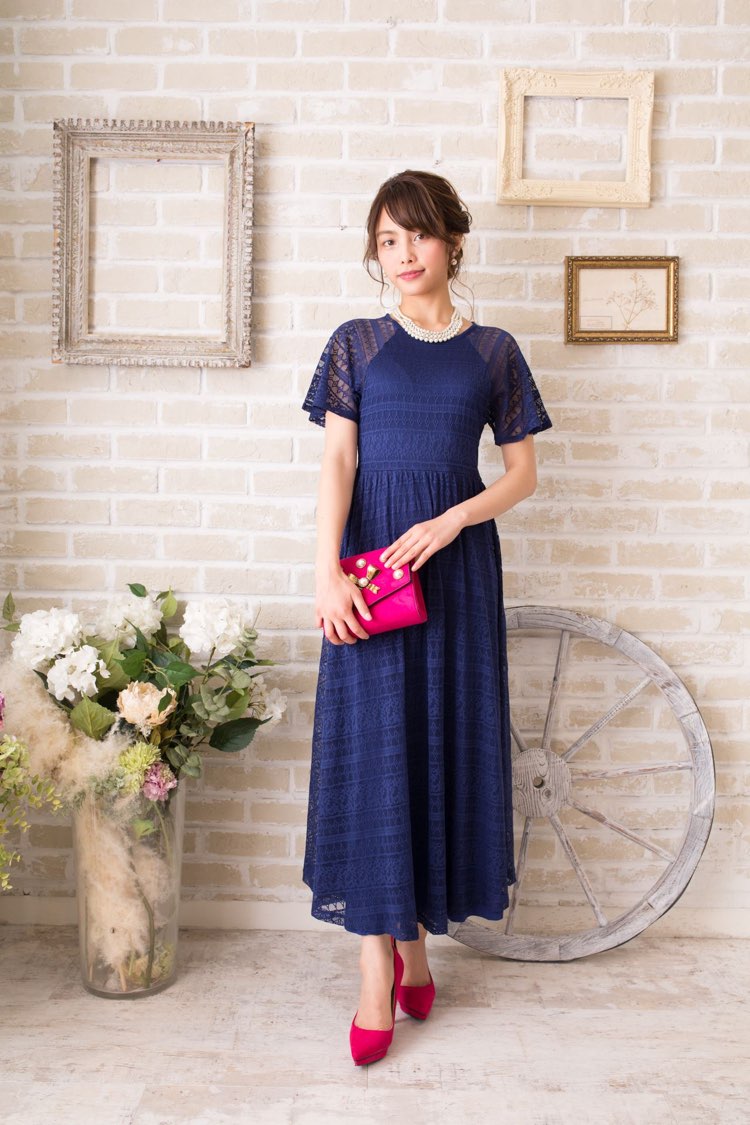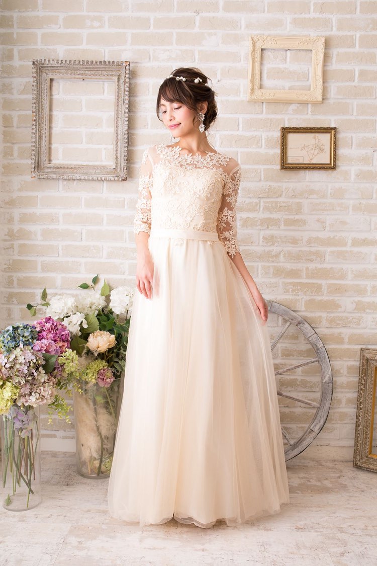 結婚式 二次会向け 全レース柄袖付きフレアスカートミモレ丈ドレス