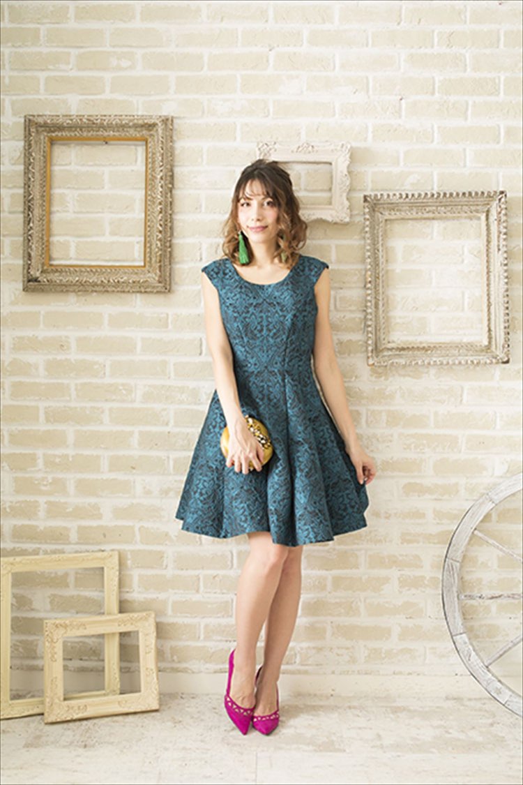 ベツィージョンソンのグリーンダマスク柄フレアドレス
