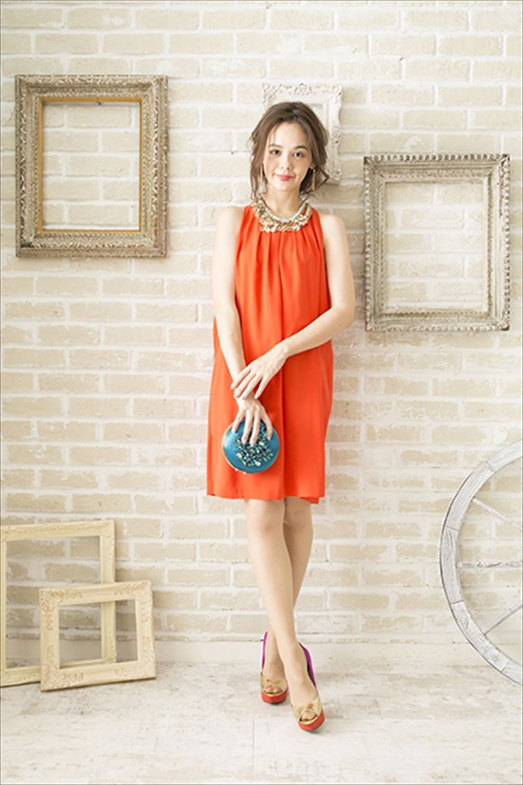 アイスブルー胸下ビジュー付きフレアベアドレス