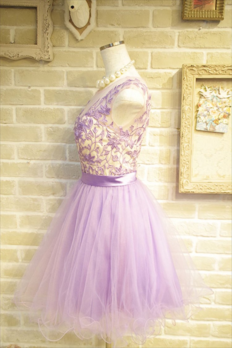 ラベンダー胸元レース柄スカートチュール切り替えミニタンク型ドレス