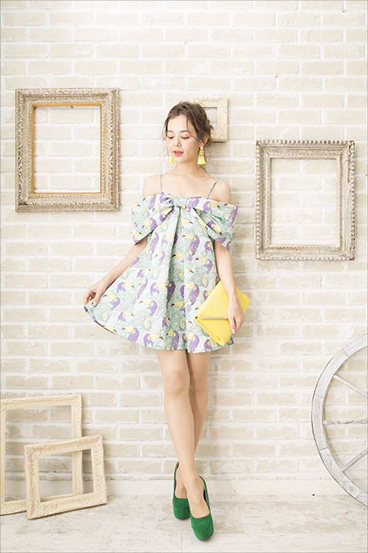 パステルイエロー右ウエストビジューボリュームミニベアドレス