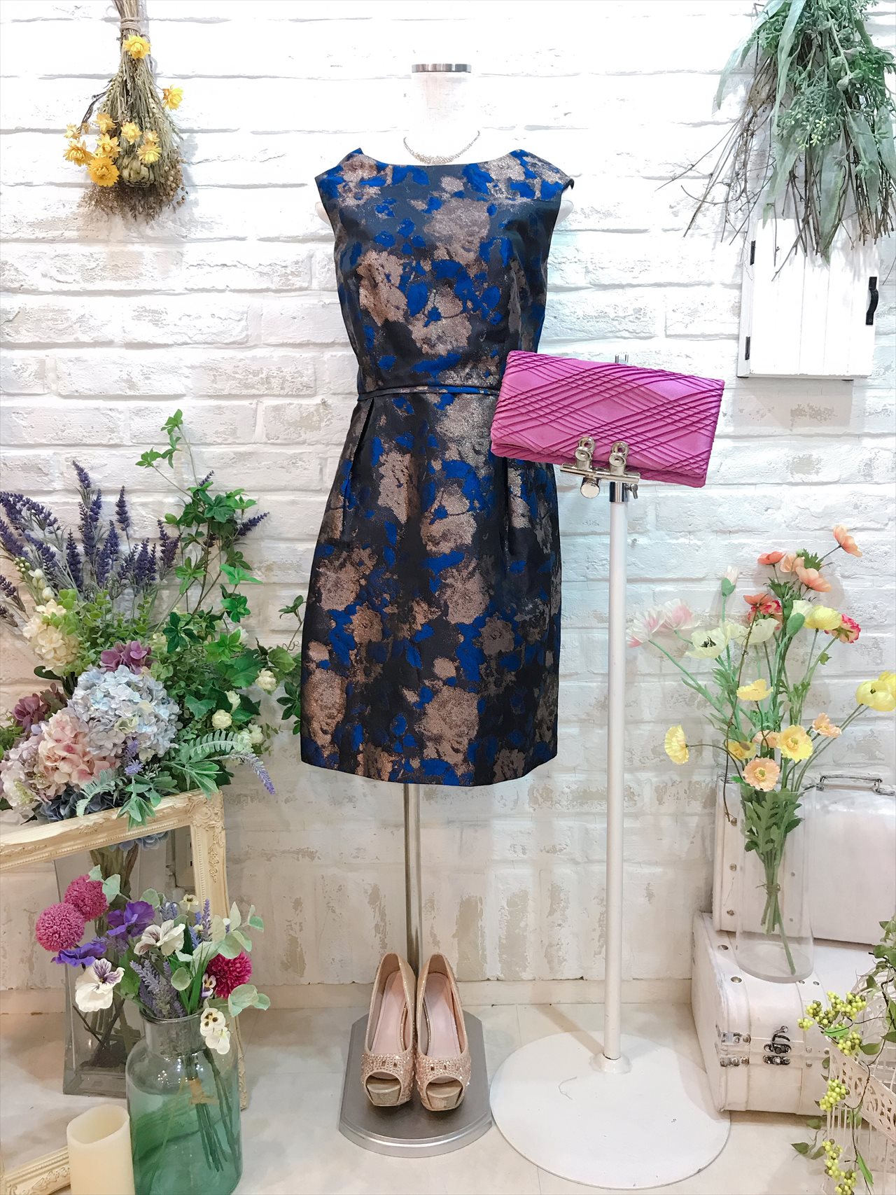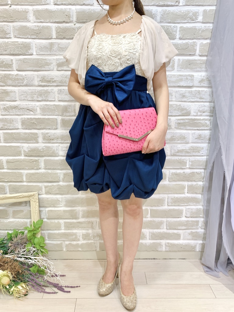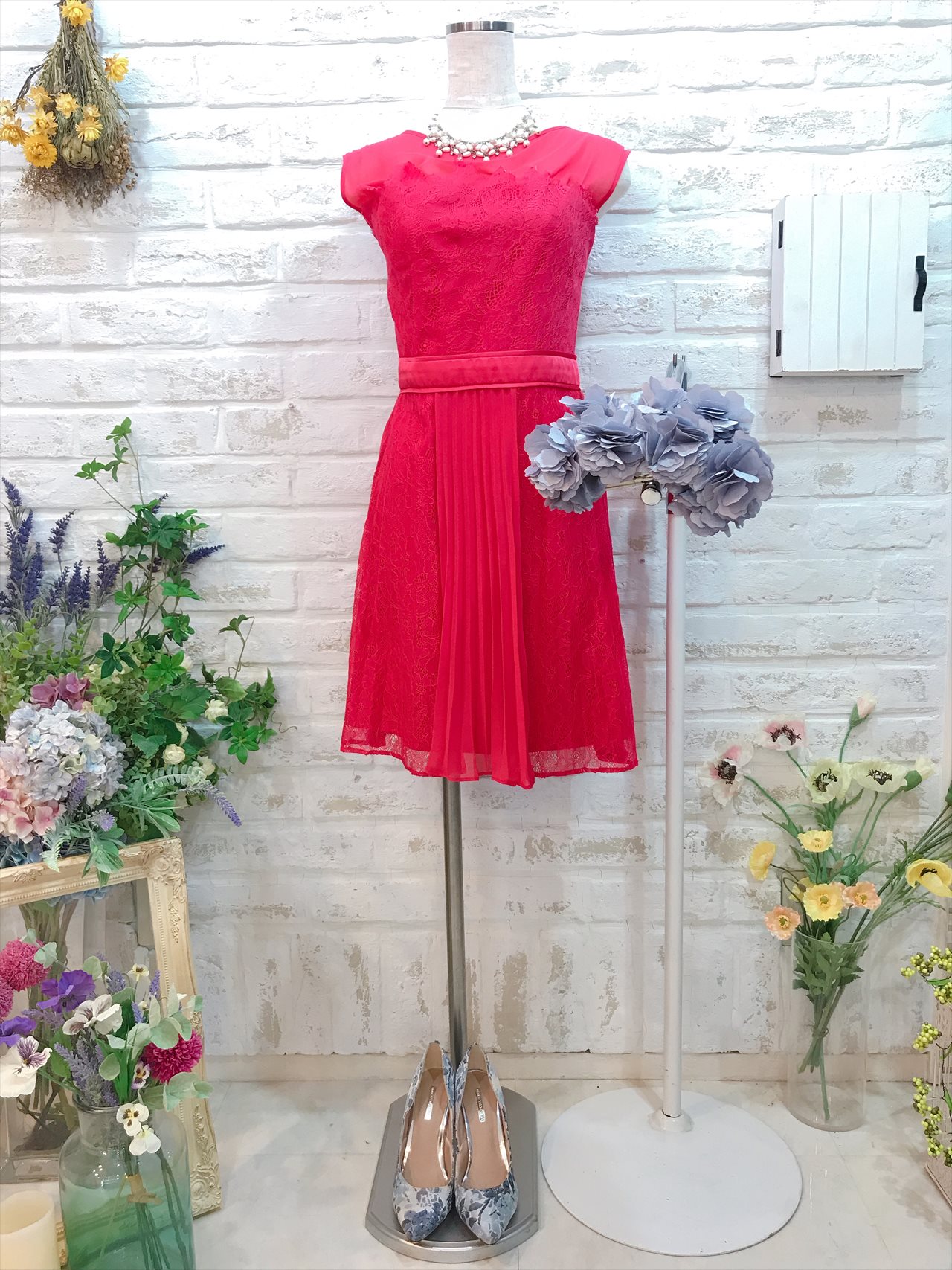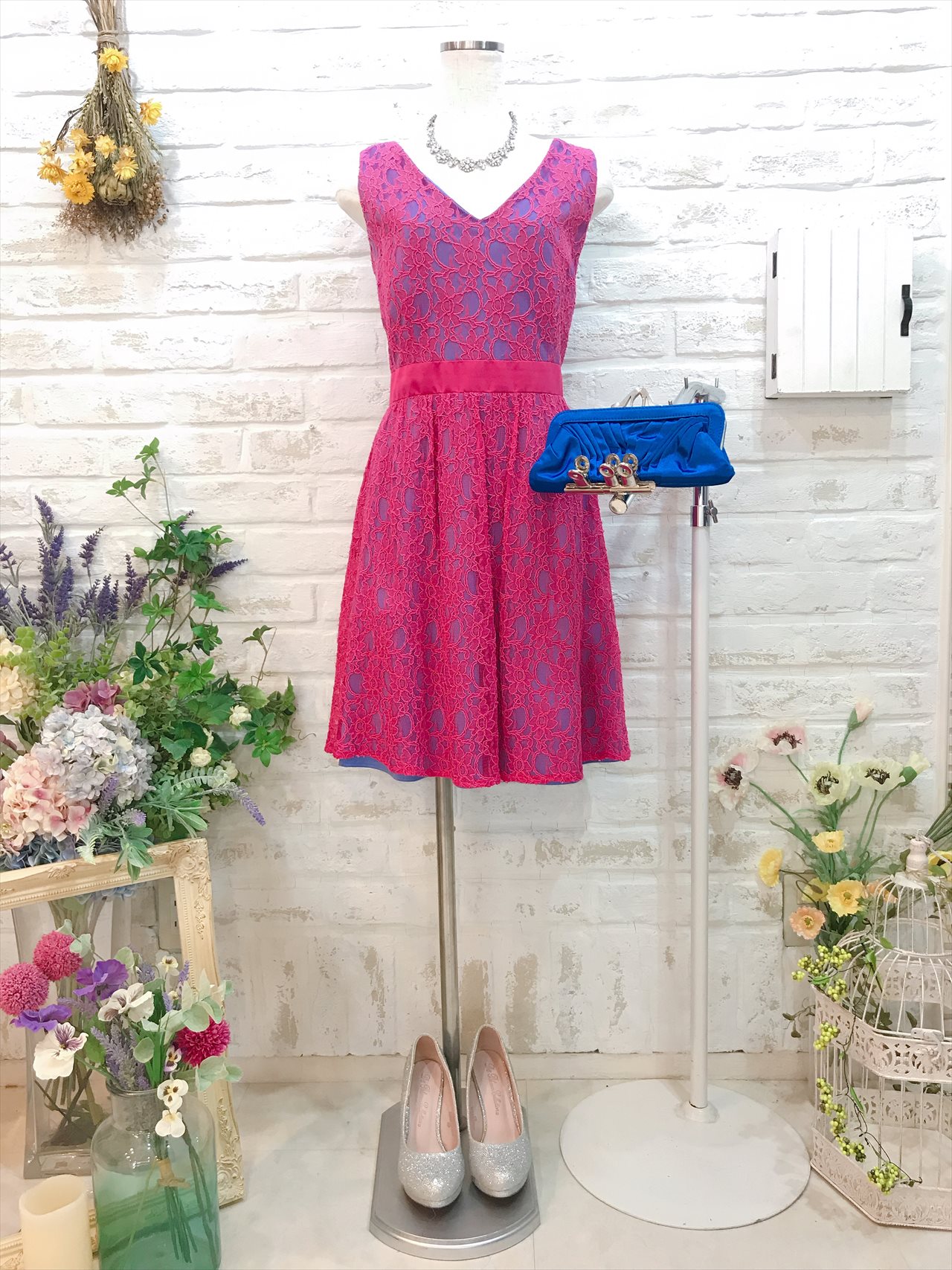 ビビットピンクレースとプリーツミニ肩ありドレス