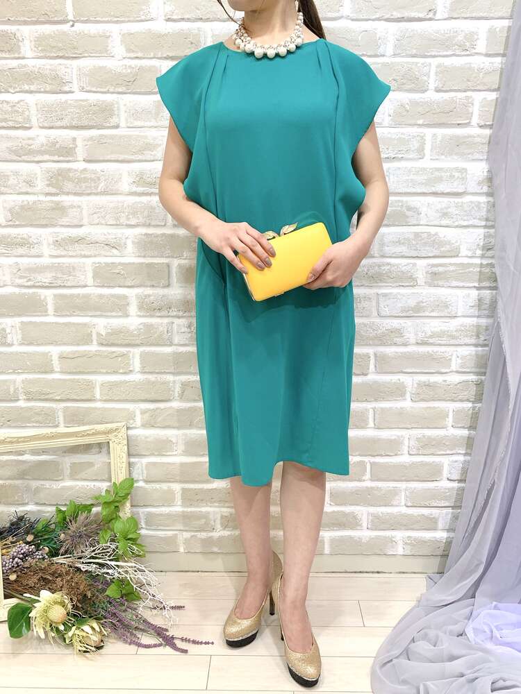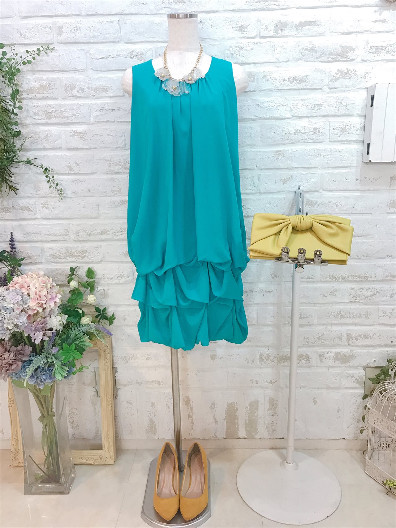ターコイズグリーン裾クシュクシュノースリーブ膝丈ドレス