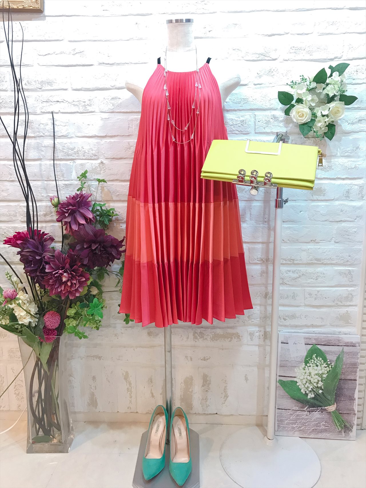 コーラルピンクカラーノースリーブ型の膝丈プリーツ...