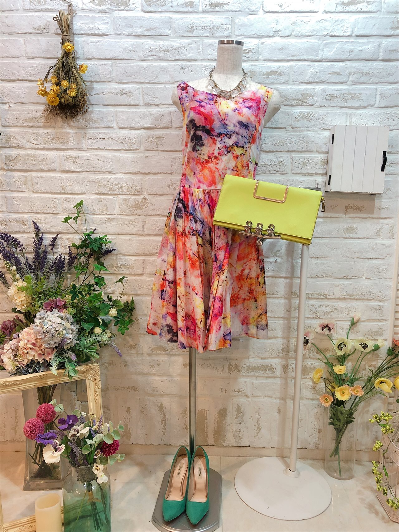ピンクまだら模様柄肩ありひざ丈ドレス