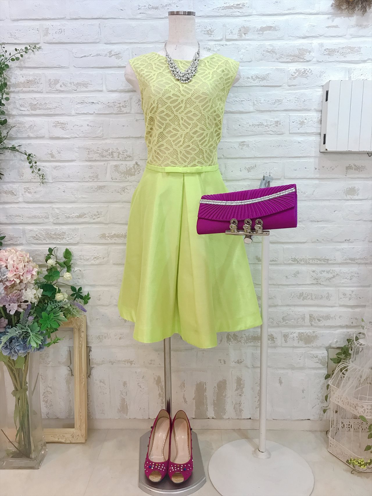 レモンイエロー胸元レースノースリーブ膝丈ドレス