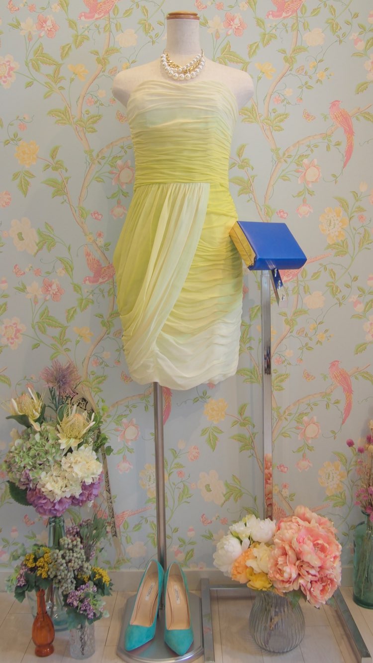 ★ネオンイエローグラデギャザータイトシルクベアドレス