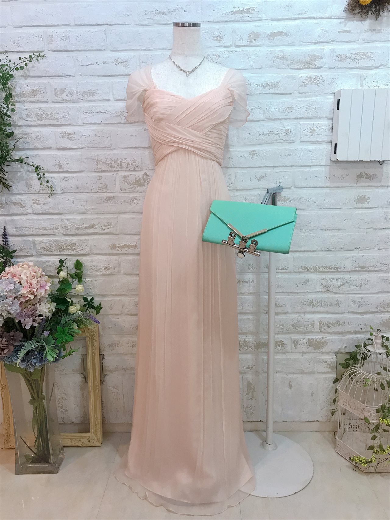 パステルピンク肩ありロングドレス