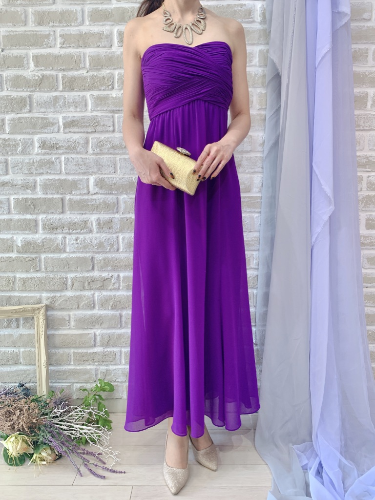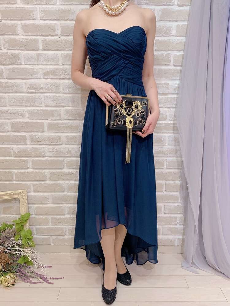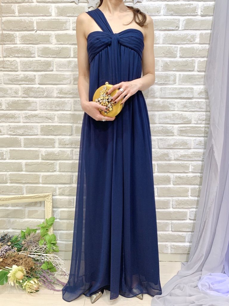 ネイビー胸下ビジュー付きプリーツロングドレス