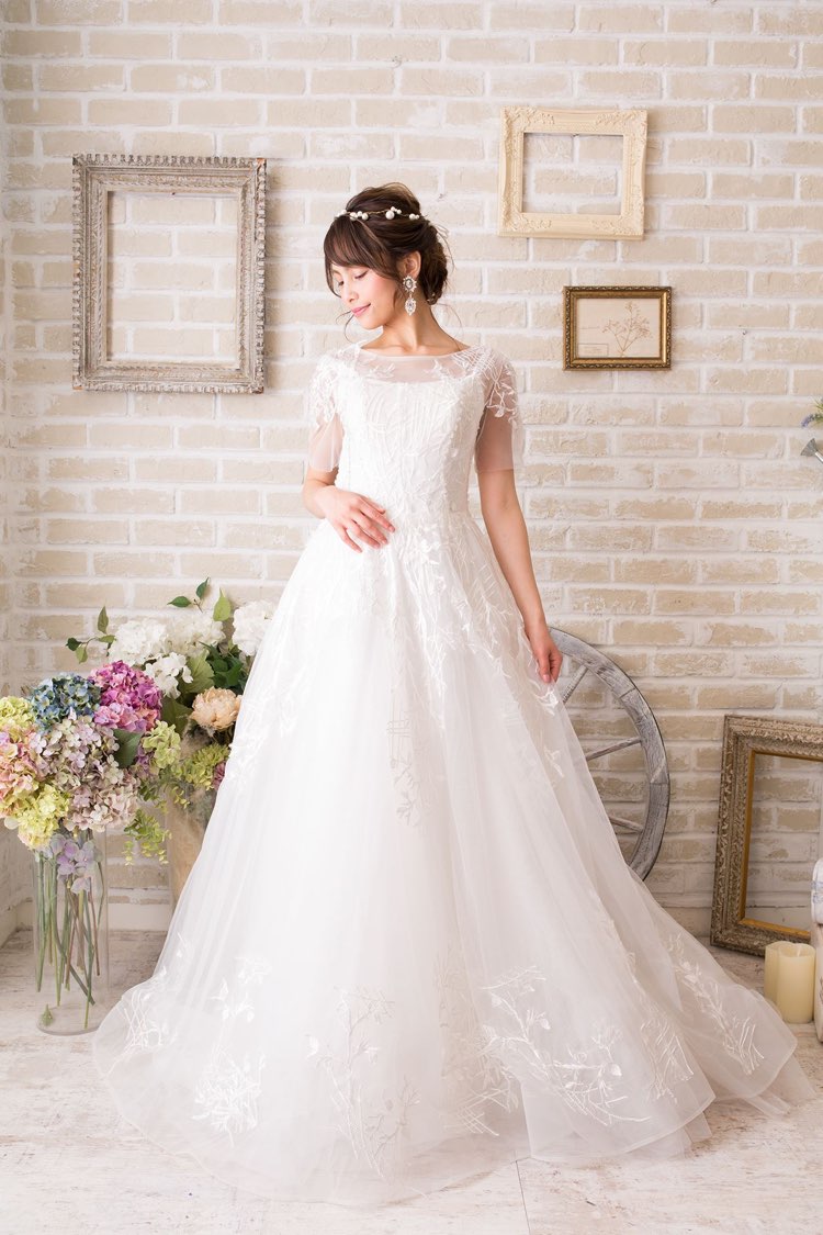 ホワイトレ刺繍&ビーズ付きウェスト切り替えAラインボリュームウェディングドレス