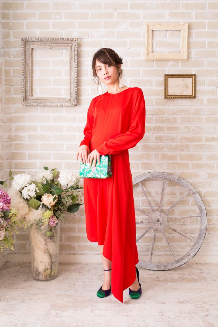 朱色アシンメトリーロングスリーブドレス