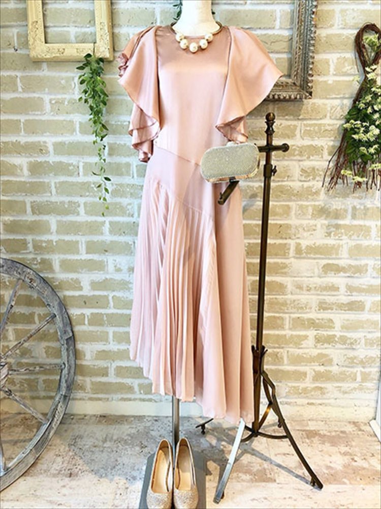 光沢ベビーピンクフレア袖付きアシンメトリーアンクル丈プリーツドレス